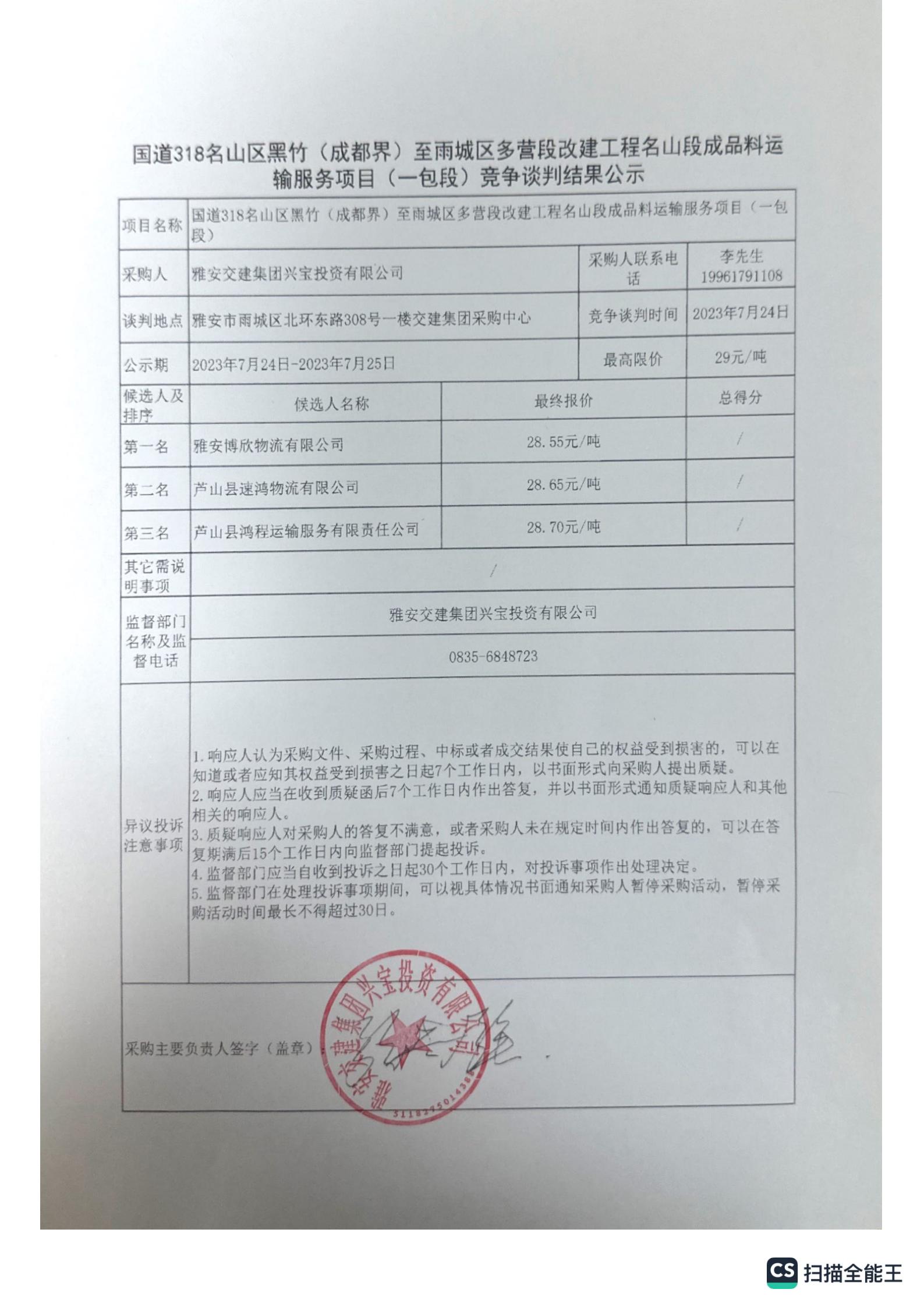 雅安交建集團(tuán)興寶投資有限公司國道318名山區(qū)黑竹(成都界)至雨城區(qū)多營段改建工程名山段成品料運(yùn)輸服務(wù)項(xiàng)目(二包段)競爭談判結(jié)果公示