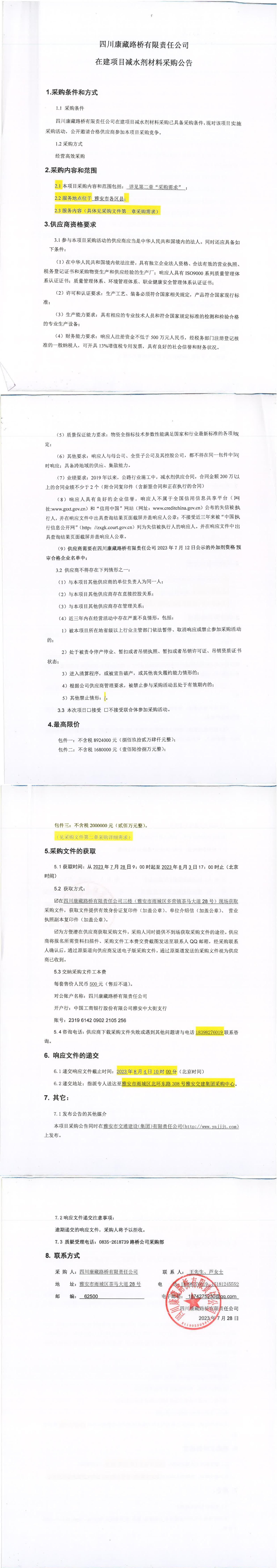 四川康藏路橋有限責任公司在建項目減水劑材料采購公告