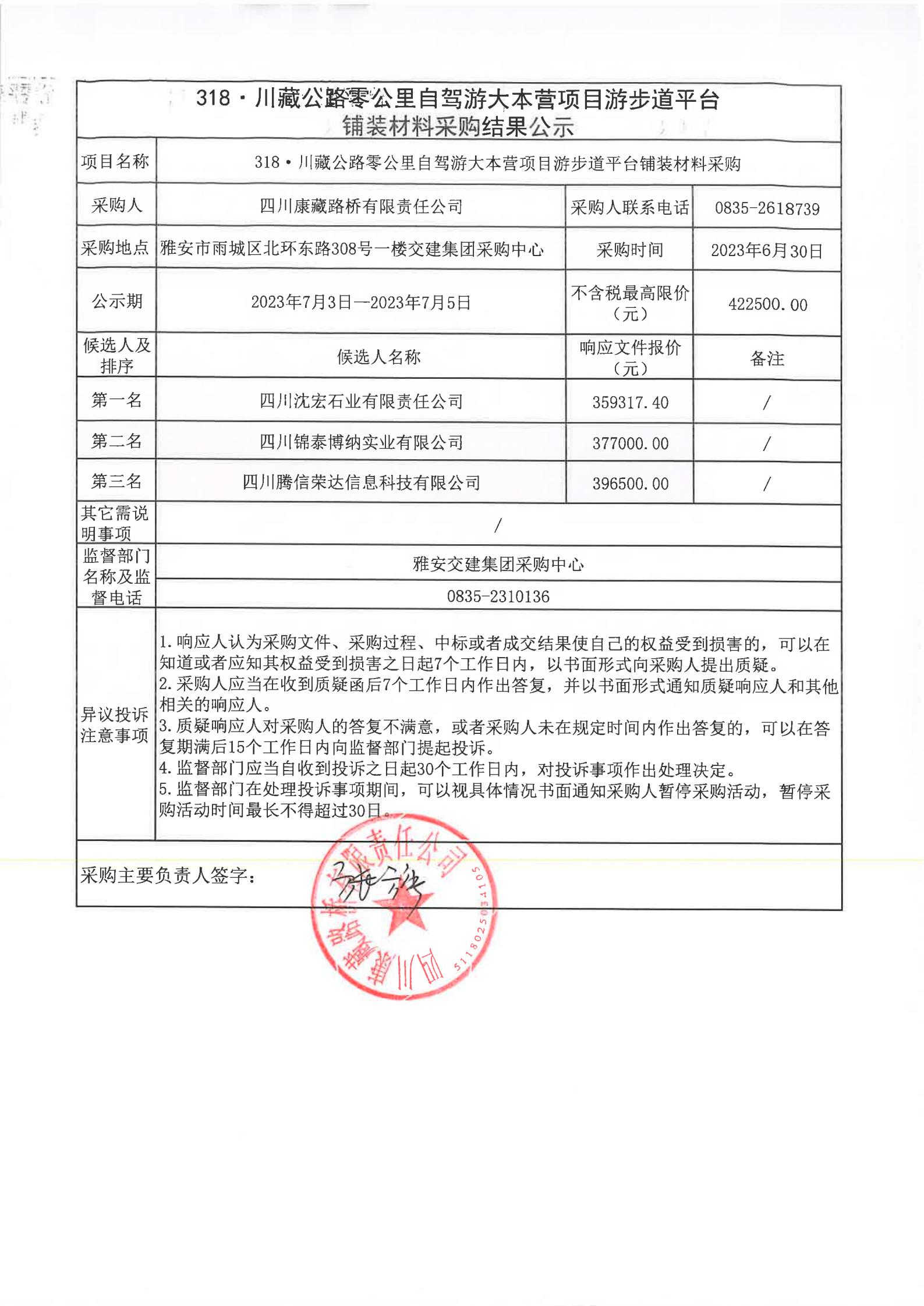 四川康藏路橋有限責任公司318·川藏公路零公里自駕游大本營項目游步道平臺鋪裝材料采購結果公示