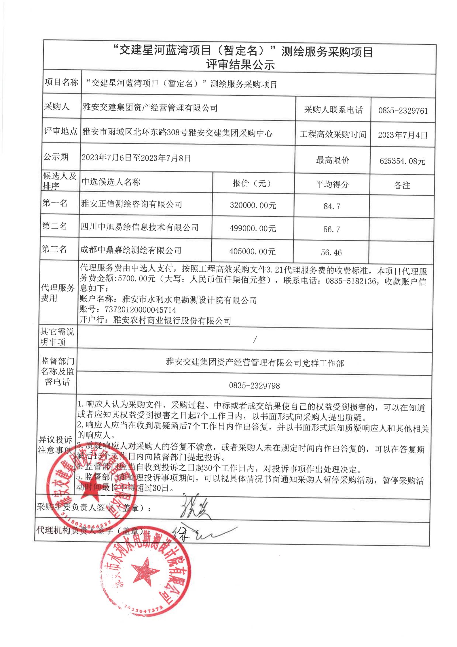 雅安交建集團資產經(jīng)營管理有限公司“交建星河藍灣項目(暫定名)”測繪服務采購項目評審結果公示