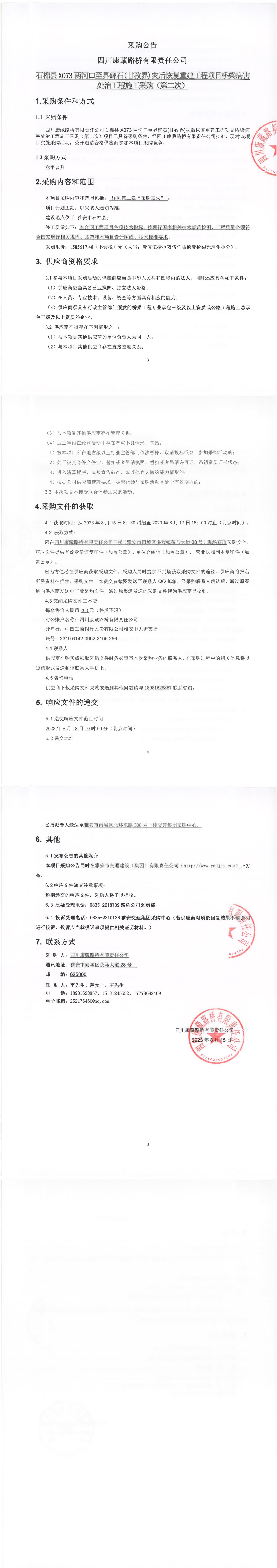 四川康藏路橋有限責(zé)任公司石棉縣X703兩河口至界碑石(甘孜界)災(zāi)后恢復(fù)重建工程項(xiàng)目橋梁病害處治工程施工采購(gòu)(第二次)