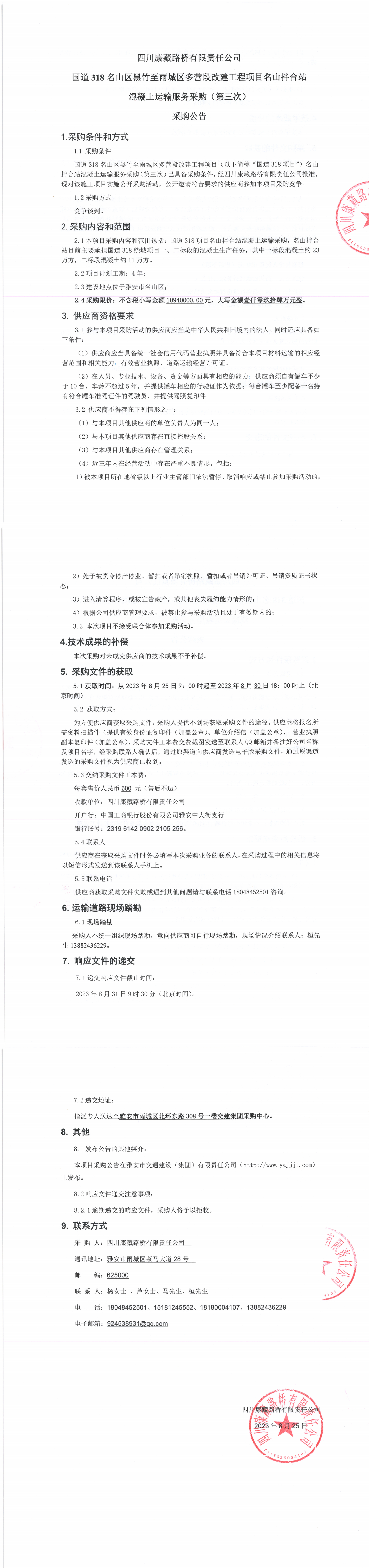 四川康藏路橋有限責任公司國道318名山區(qū)黑竹至雨城區(qū)多營段改建工程項目名山拌合站混凝土運輸服務(wù)采購(第三次)采購公告