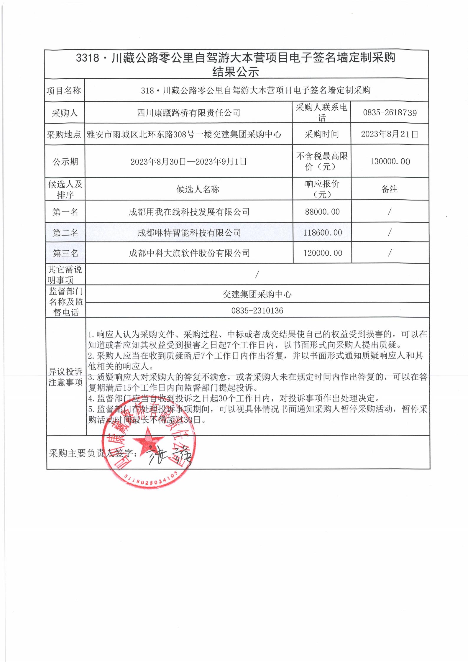 四川康藏路橋有限責(zé)任公司318·川藏公路零公里自駕游大本營項目電子簽名墻定制采購結(jié)果公示