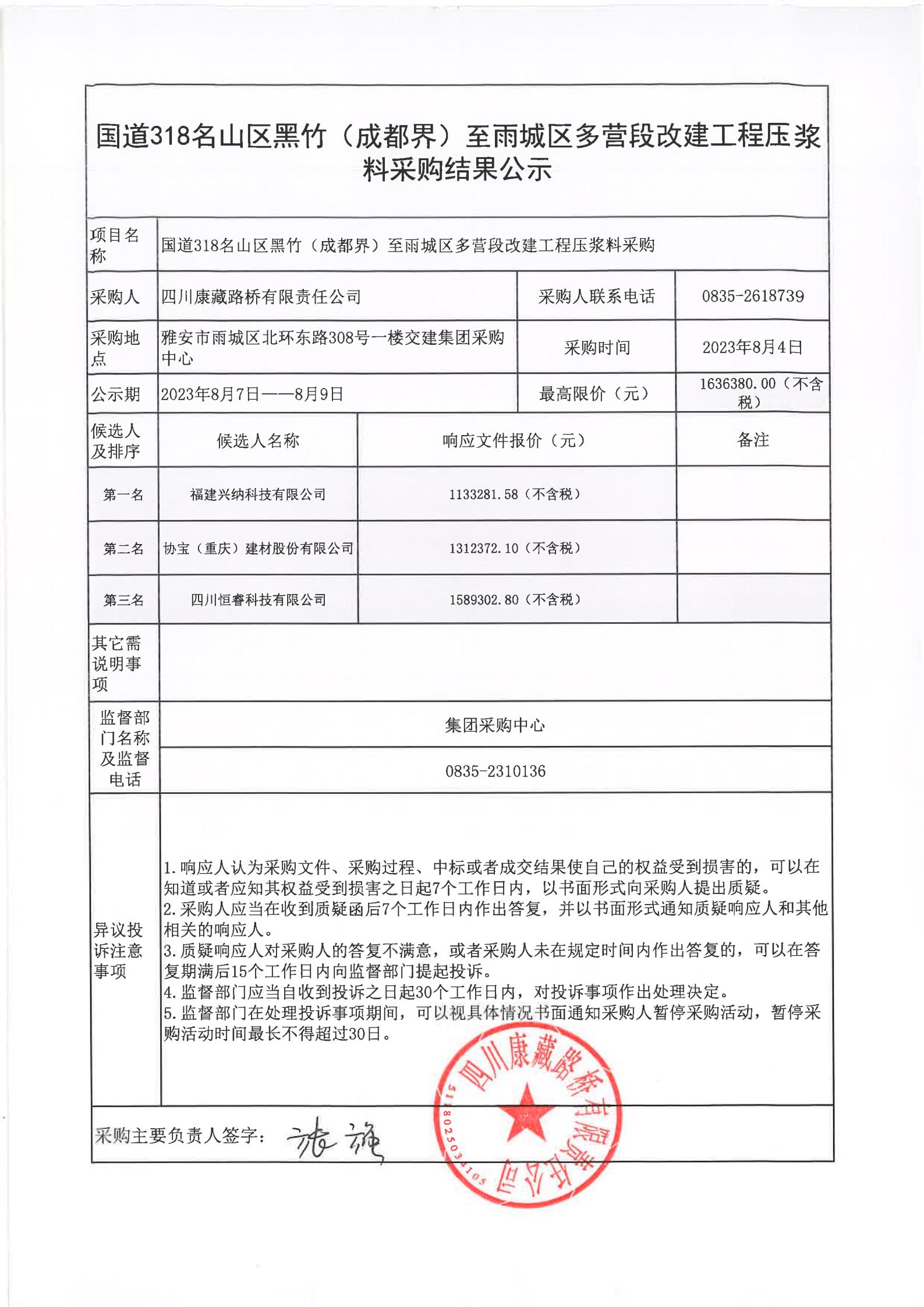四川康藏路橋有限責(zé)任公司國(guó)道318名山區(qū)黑竹(成都界)至雨城區(qū)多營(yíng)段改建工程壓漿料采購結(jié)果公示