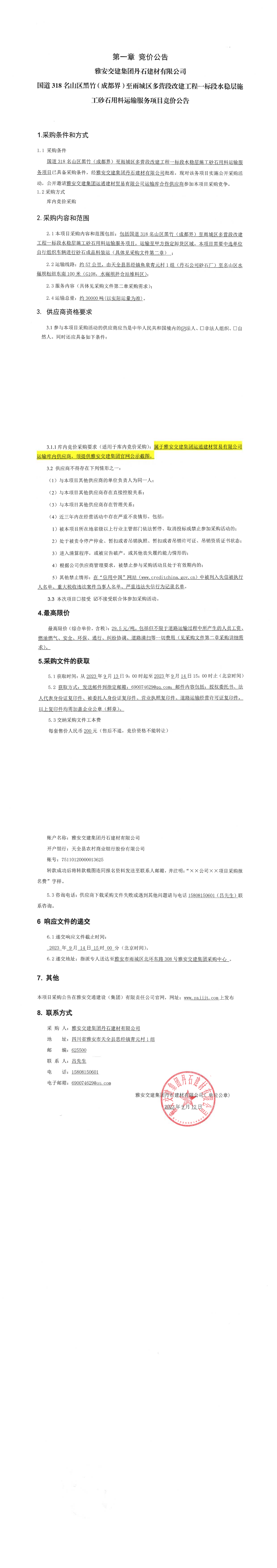雅安交建集團(tuán)丹石建材有限公司國道318名山區(qū)黑竹(成都界)至雨城區(qū)多營段改建工程一標(biāo)段水穩(wěn)層施工砂石用料運(yùn)輸服務(wù)項(xiàng)目競價(jià)公告