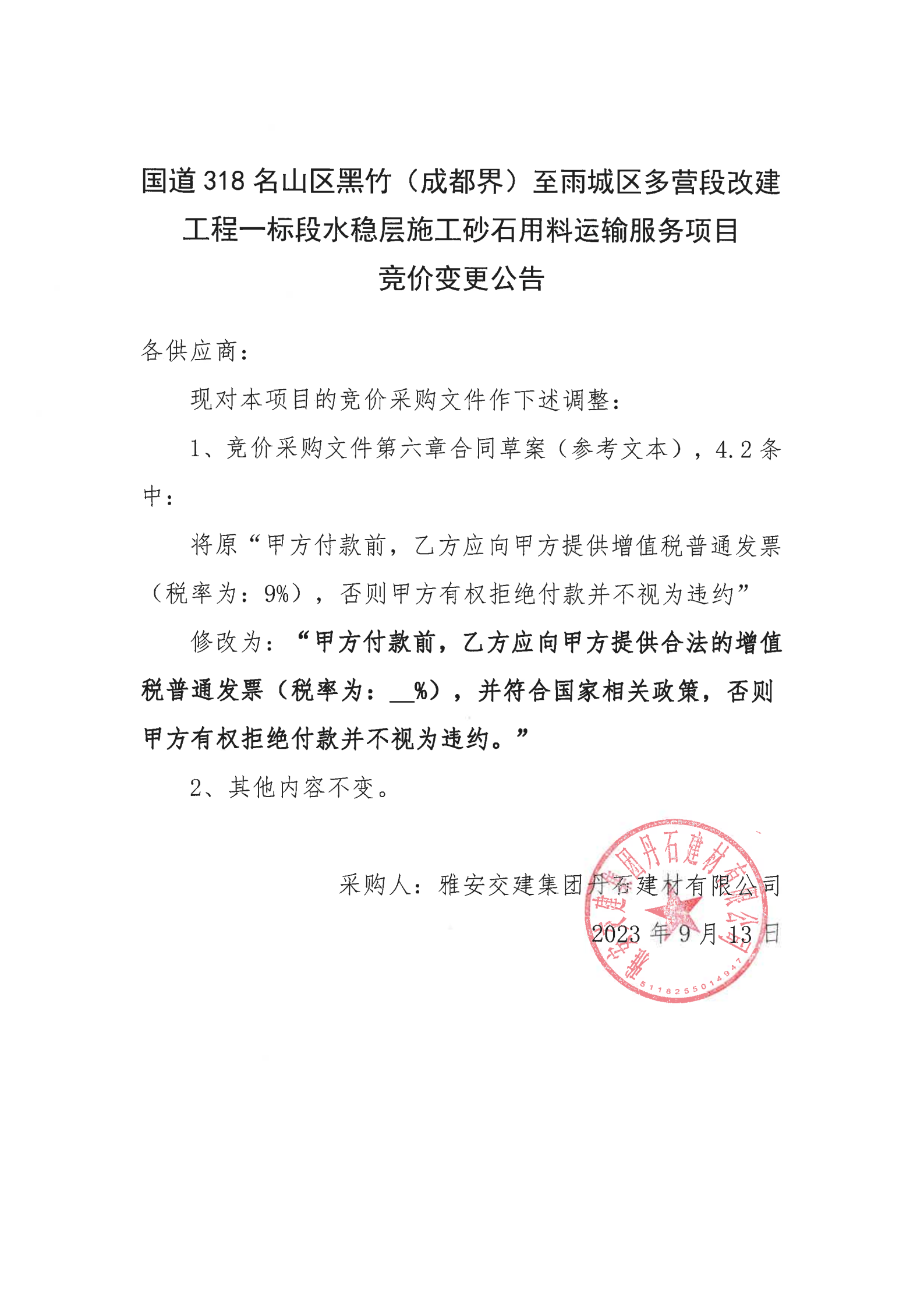 雅安交建集團丹石建材有限公司國道318名山區(qū)黑竹(成都界)至雨城區(qū)多營段改建工程一標段水穩(wěn)層施工砂石用料運輸服務(wù)項目競價變更公告