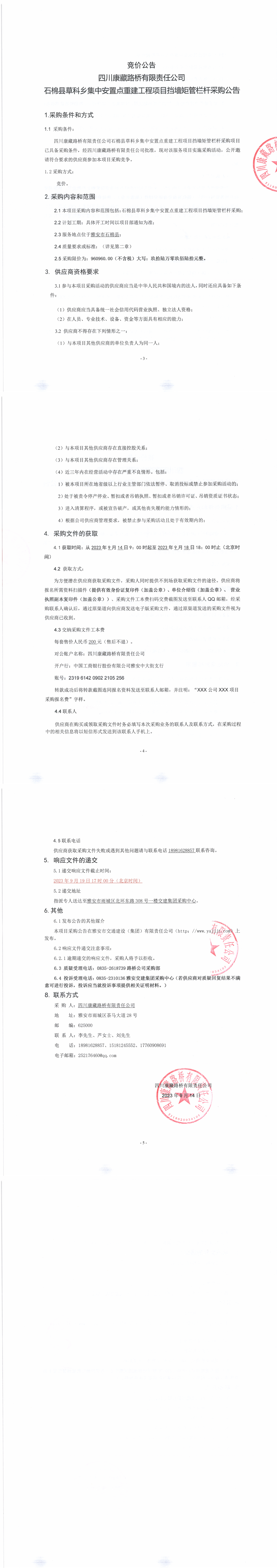 四川康藏路橋有限責(zé)任公司石棉縣草科鄉(xiāng)集中安置點重建工程項目擋墻矩管欄桿采購公告