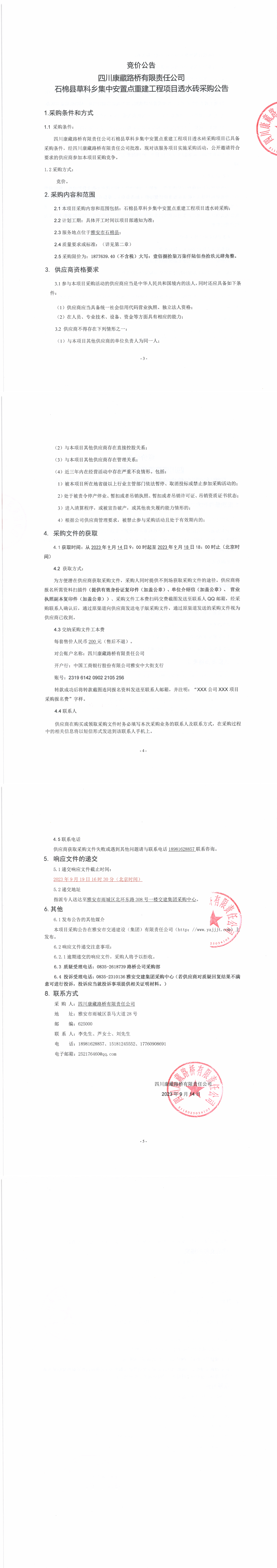 四川康藏路橋有限責(zé)任公司石棉縣草科鄉(xiāng)集中安置點(diǎn)重建工程項(xiàng)目透水磚采購公告
