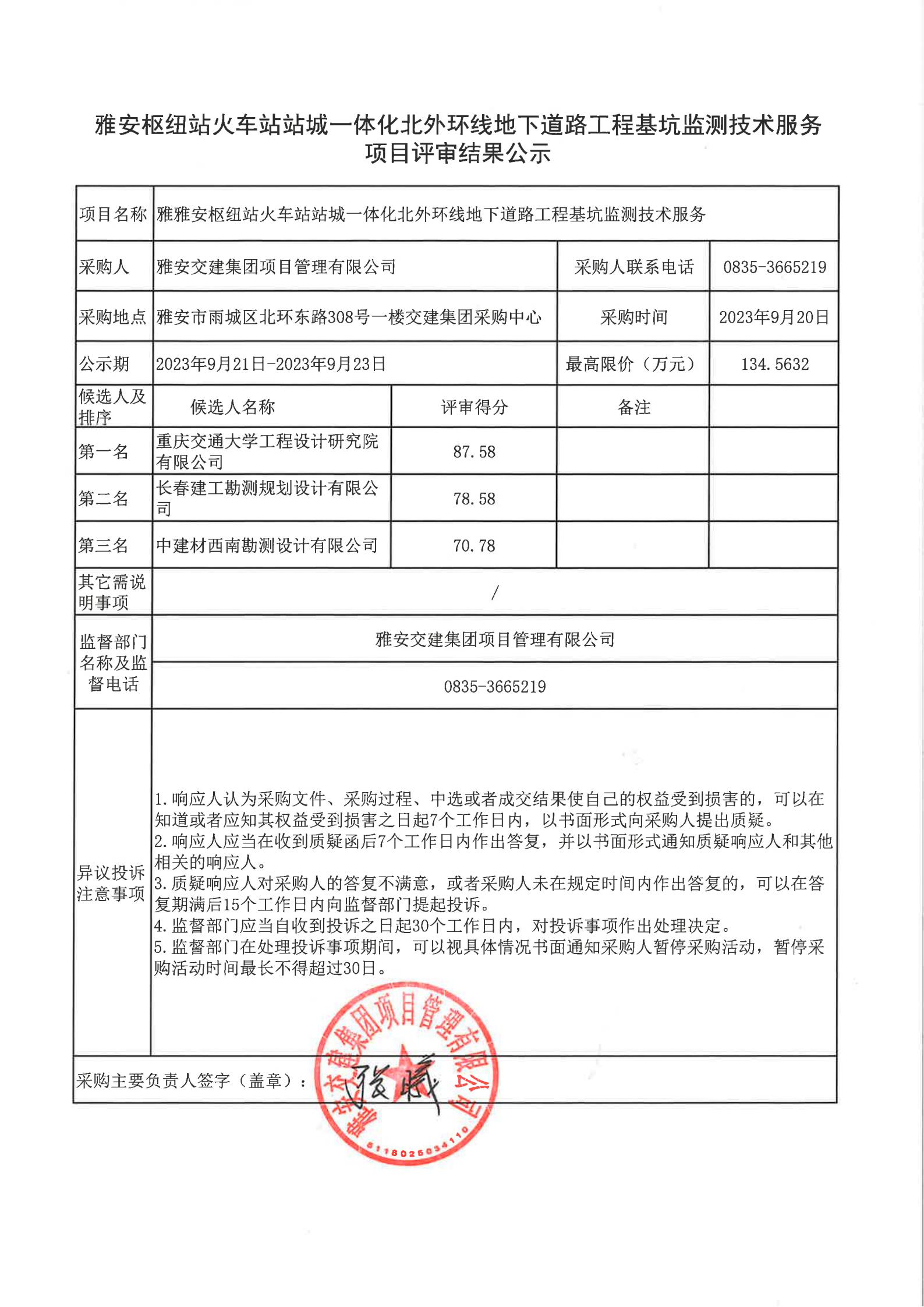 雅安交建集團(tuán)項(xiàng)目管理有限公司雅安樞紐站火車(chē)站站城一體化北外環(huán)線地下道路工程基坑監(jiān)測(cè)技術(shù)服務(wù)項(xiàng)目評(píng)審結(jié)果公示