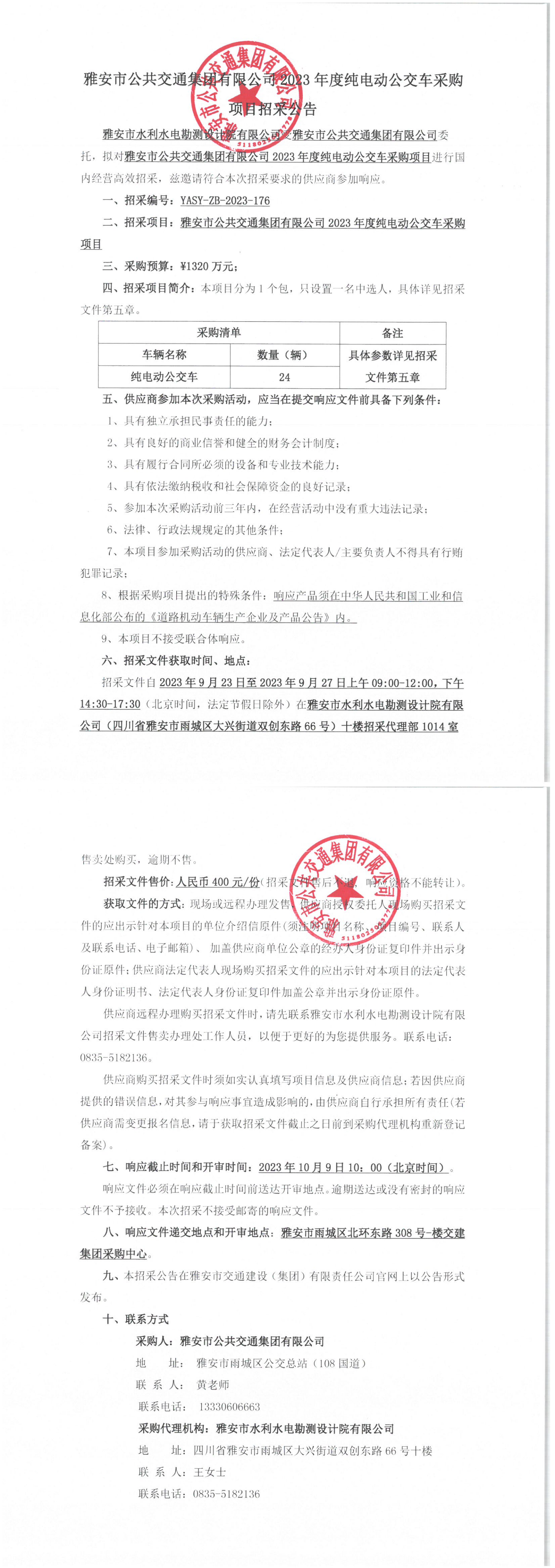 雅安市公共交通集團(tuán)有限公司2023年度純電動(dòng)車公交車采購(gòu)項(xiàng)目招采公告