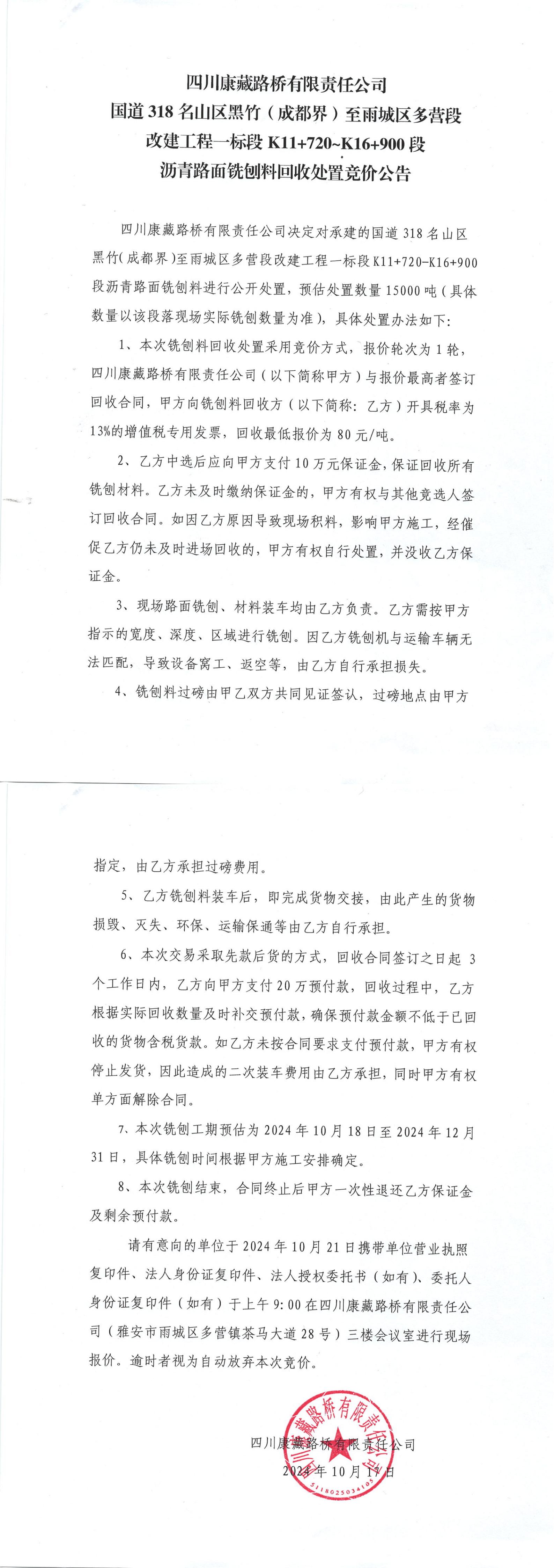 四川康藏路橋有限責(zé)任公司國(guó)道318名山區(qū)黑竹(成都界)至雨城區(qū)多營(yíng)段改建工程一標(biāo)段K11+720—K16+900段瀝青路面銑刨料回收處置競(jìng)價(jià)公告