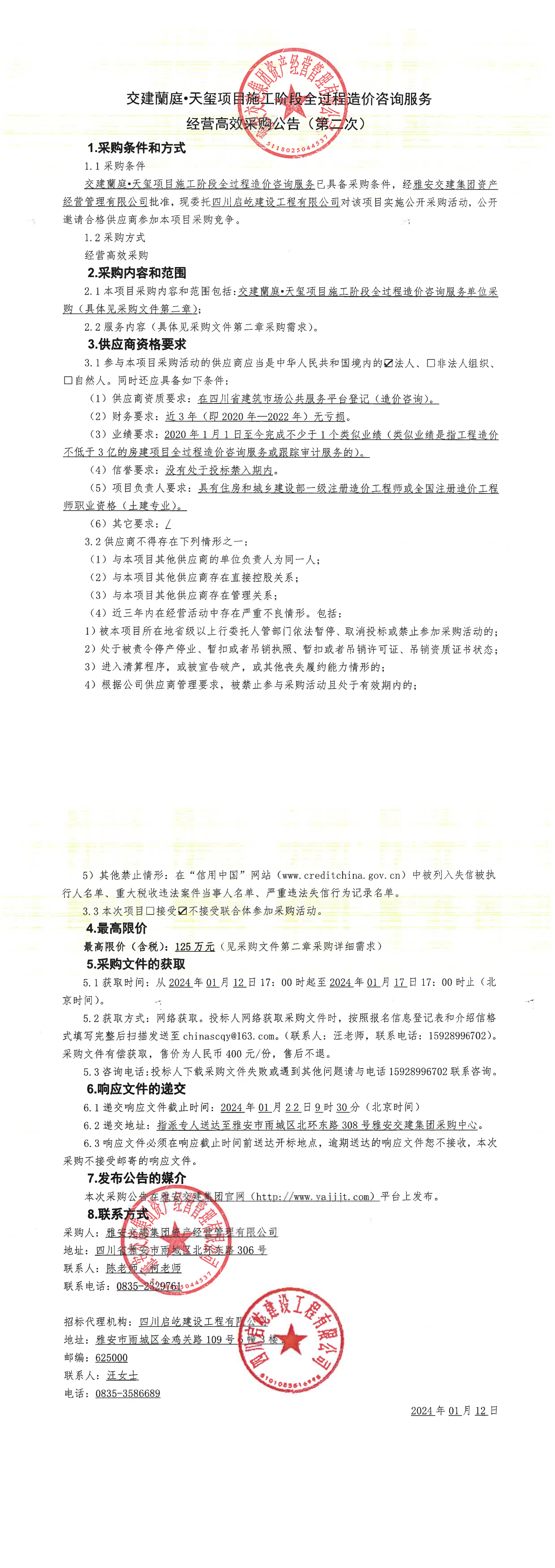 雅安交建集團資產經營管理有限公司交建蘭庭·天璽項目施工階段全過程造價咨詢服務經營高效采購公告(第二次)