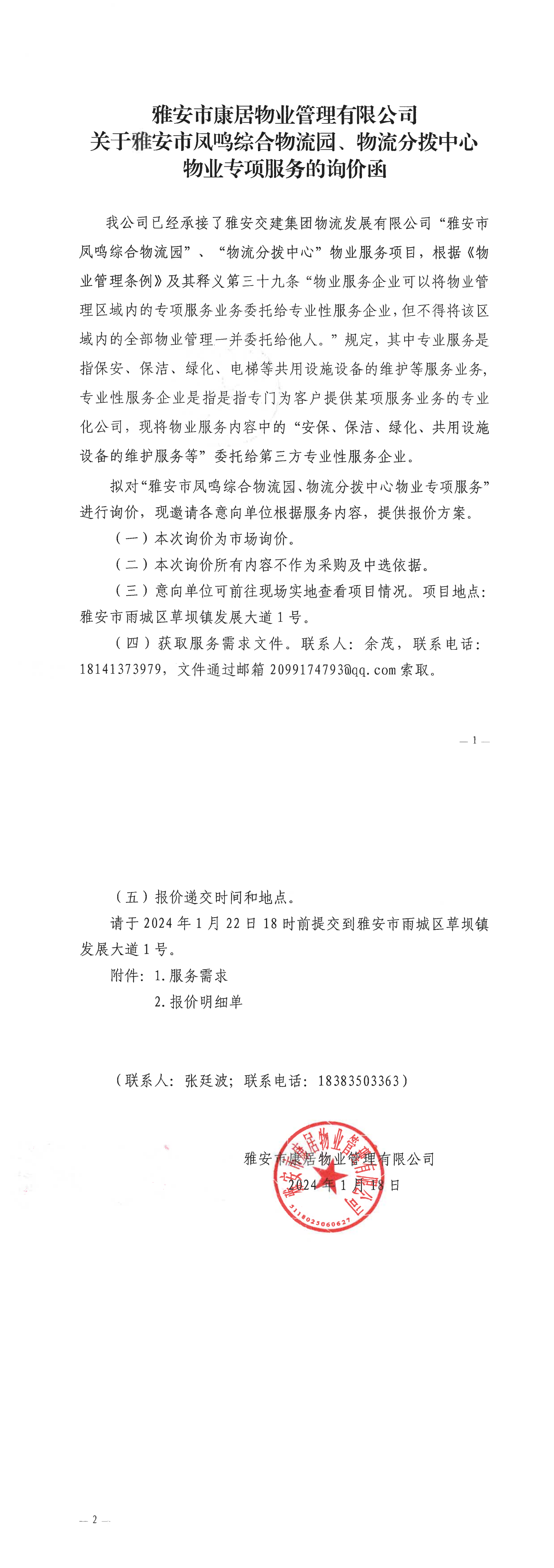 雅安市康居物業(yè)管理有限公司關(guān)于雅安市鳳鳴綜合物流園、物流分撥中心物業(yè)專項服務的詢價函