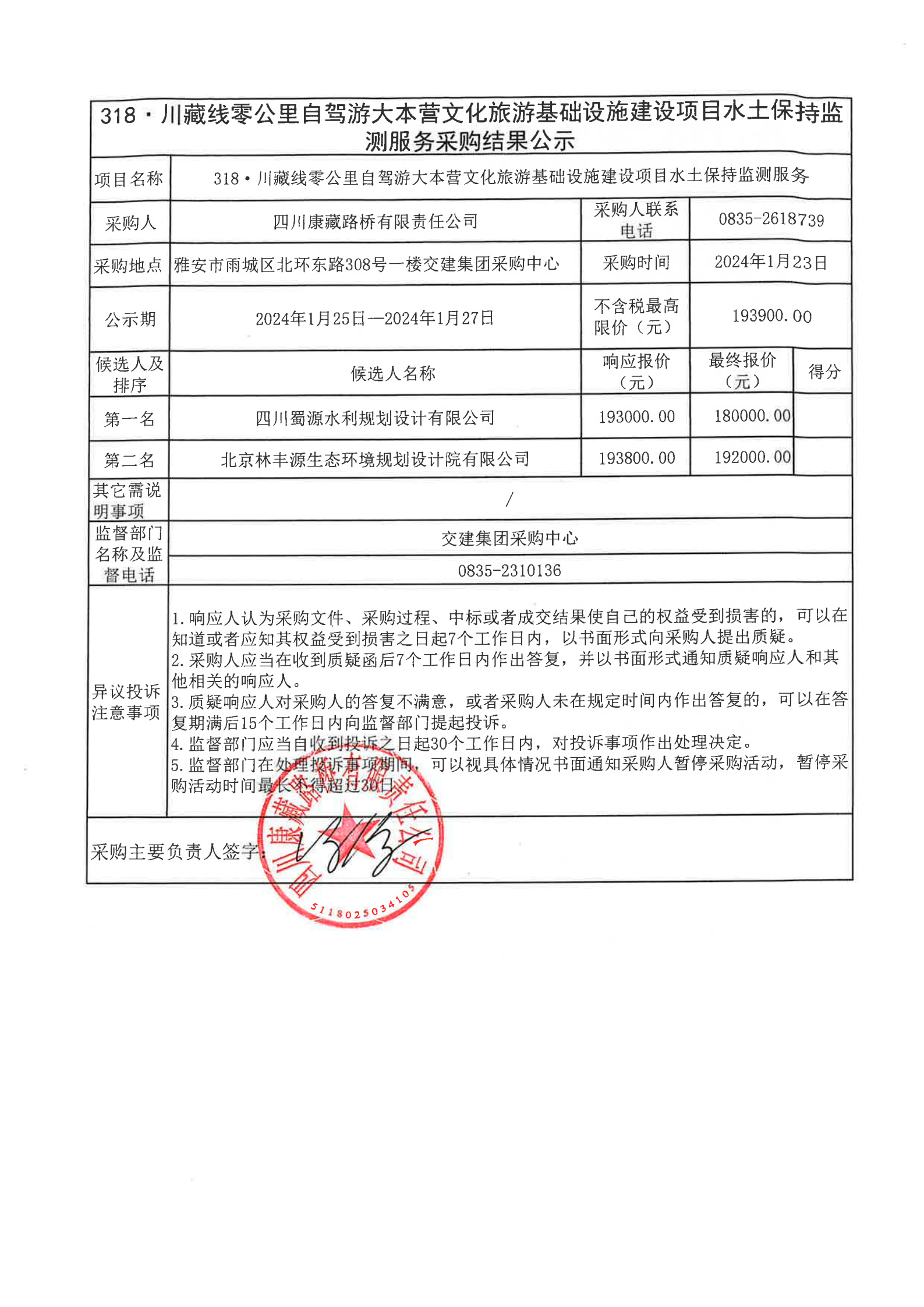四川康藏路橋有限責任公司318·川藏線零公里自駕游大本營文化旅游基礎設施建設項目水土保持監(jiān)測服務采購結果公示