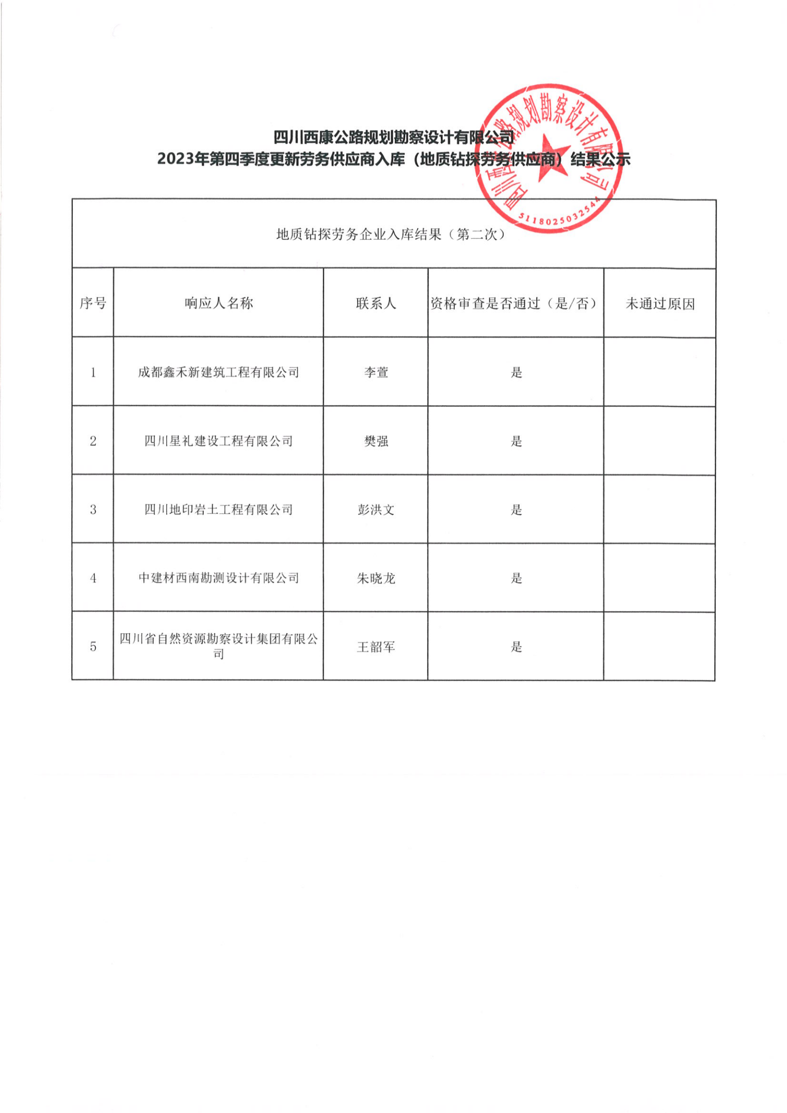 四川西康公路規(guī)劃勘察設(shè)計(jì)有限公司2023年第四季度更新勞務(wù)供應(yīng)入庫(kù) (地質(zhì)鉆探勞務(wù)供應(yīng)商)結(jié)果公示