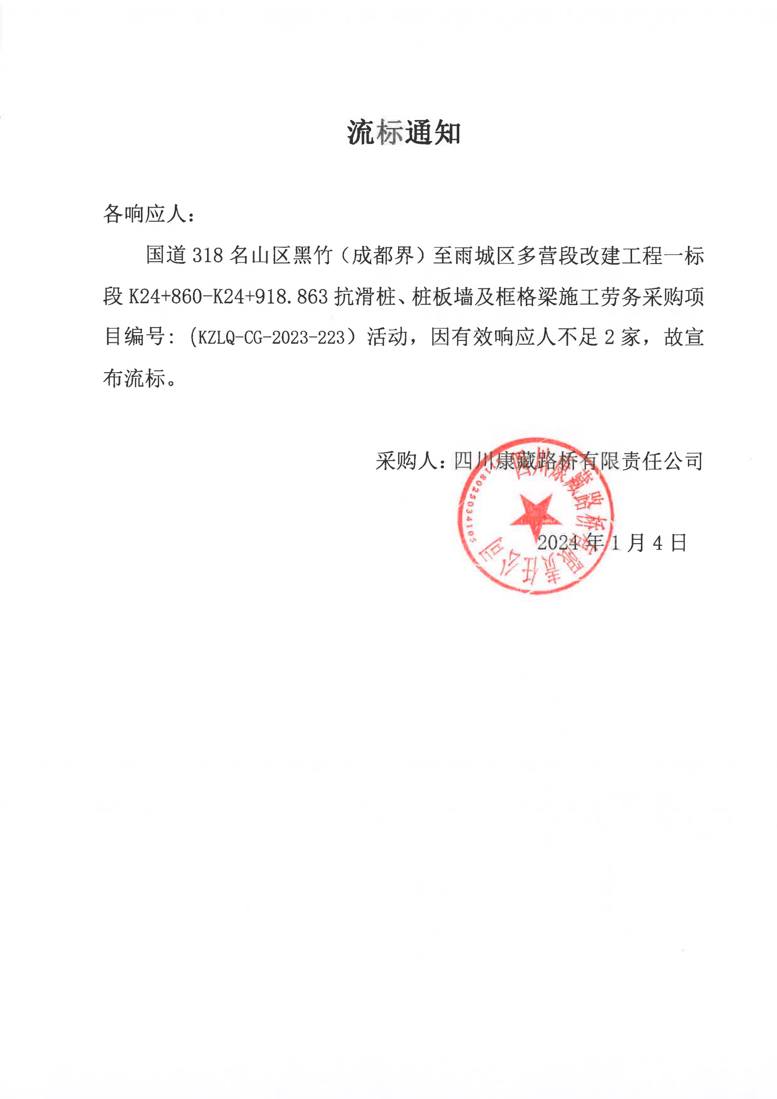 四川康藏路橋有限責(zé)任公司國(guó)道318名山區(qū)黑竹(成都界)至雨城區(qū)多營(yíng)段改建工程一標(biāo)段K24+860-K24+918.863抗滑樁、樁板墻及框格梁施工勞務(wù)采購(gòu)項(xiàng)目流標(biāo)通知