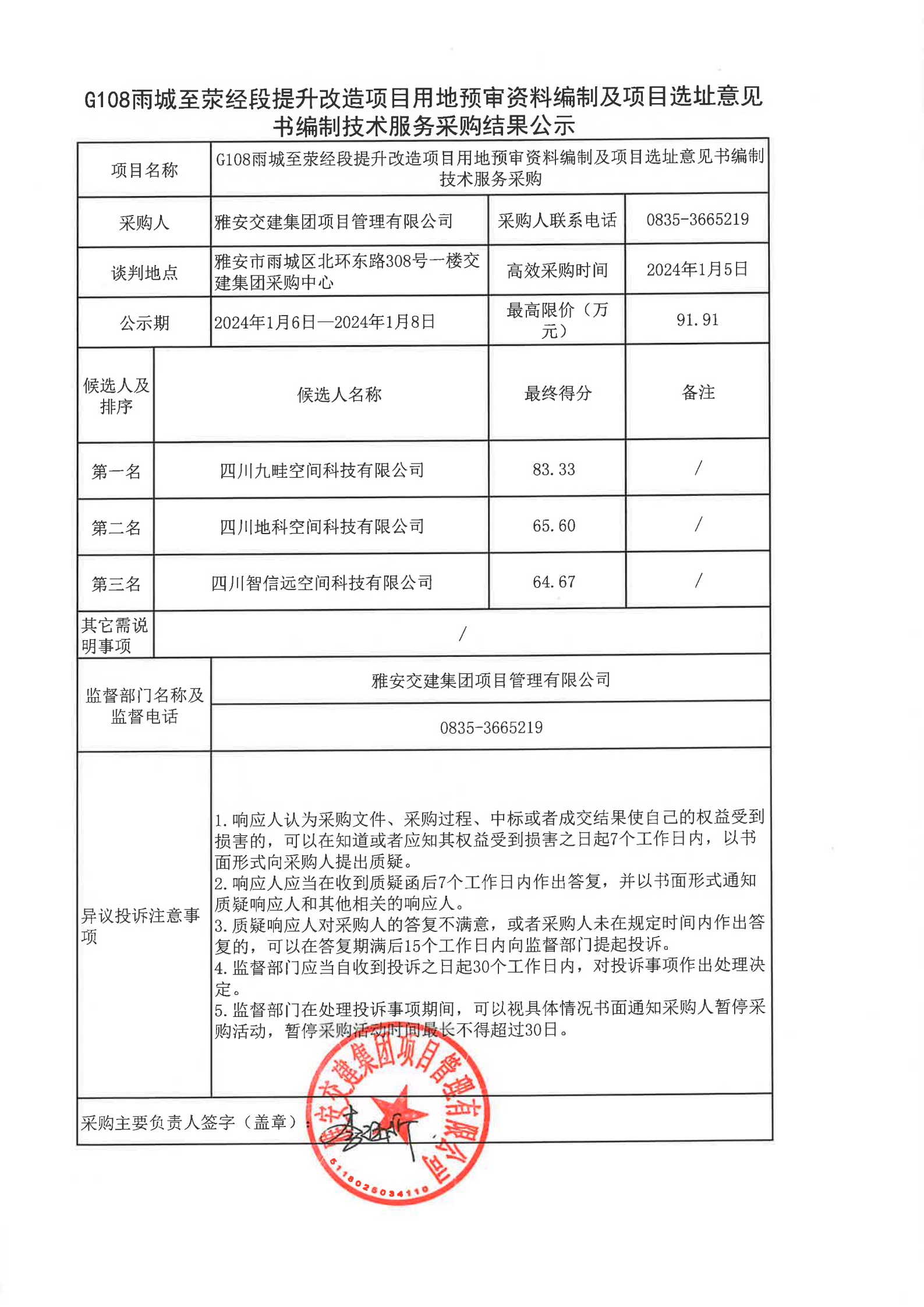 雅安交建集團項目管理有限公司G108雨城至滎經(jīng)段提升改造項目用地預審資料編制及項目選址意見書編制技術服務采購結(jié)果公示