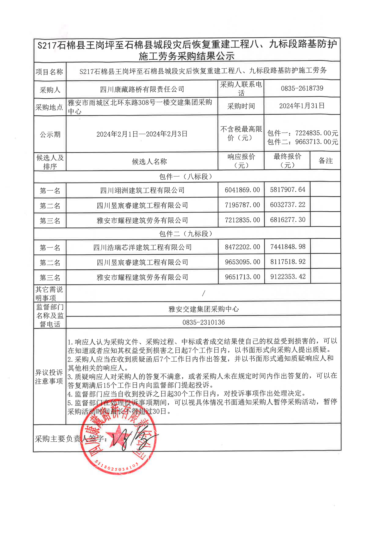 四川康藏路橋有限責任公司S217石棉縣王崗坪至石棉縣城段災(zāi)后恢復(fù)重建工程八、九標段路基防護施工勞務(wù)采購結(jié)果公示