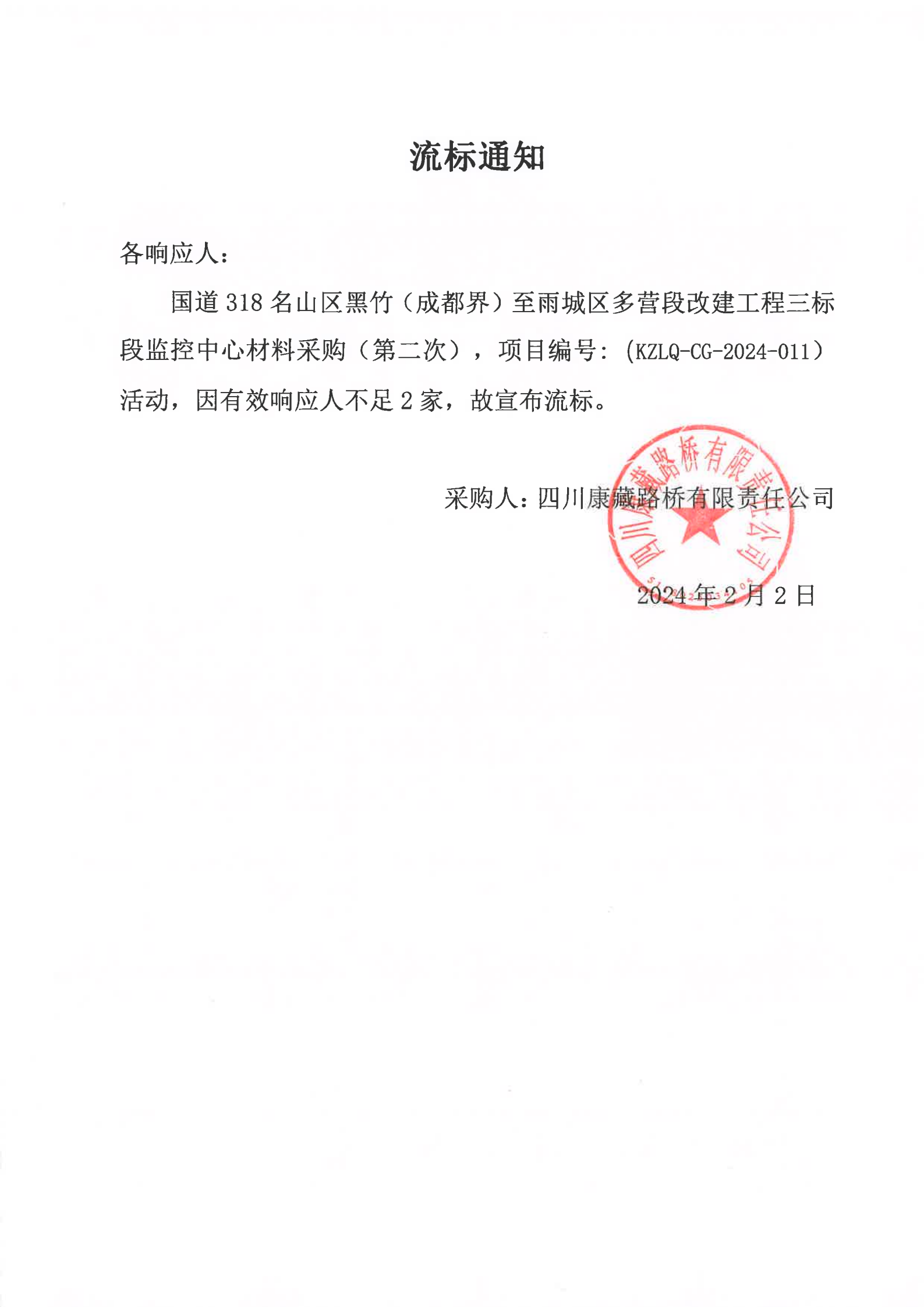 四川康藏路橋有限責(zé)任公司國(guó)道318名山區(qū)黑竹(成都界)至雨城區(qū)多營(yíng)段改建工程三標(biāo)段監(jiān)控中心材料采購(gòu)(第二次)流標(biāo)通知