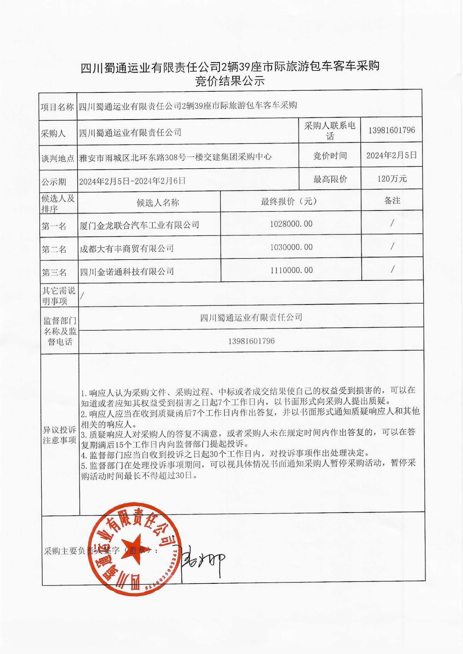 四川蜀通運業(yè)有限責(zé)任公司2輛39座市際旅游包車客車采購競價結(jié)果公示