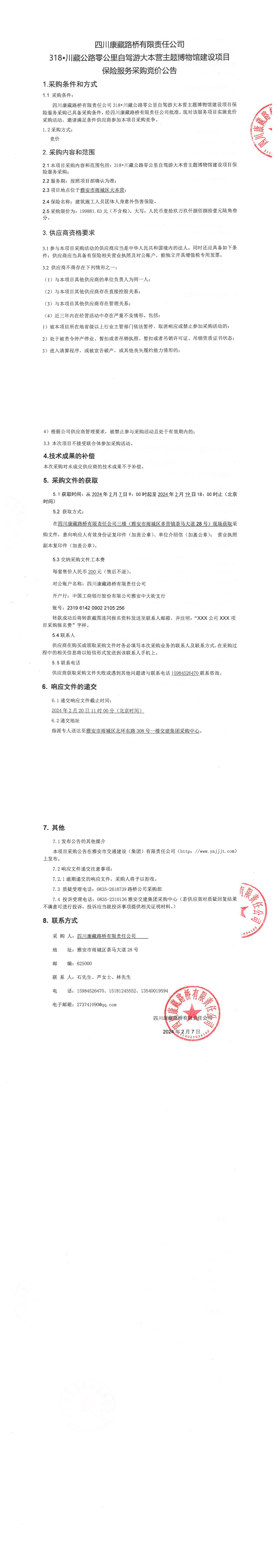四川康藏路橋有限責(zé)任公司318•川藏公路零公里自駕游大本營(yíng)主題博物館建設(shè)項(xiàng)目保險(xiǎn)服務(wù)采購(gòu)公告