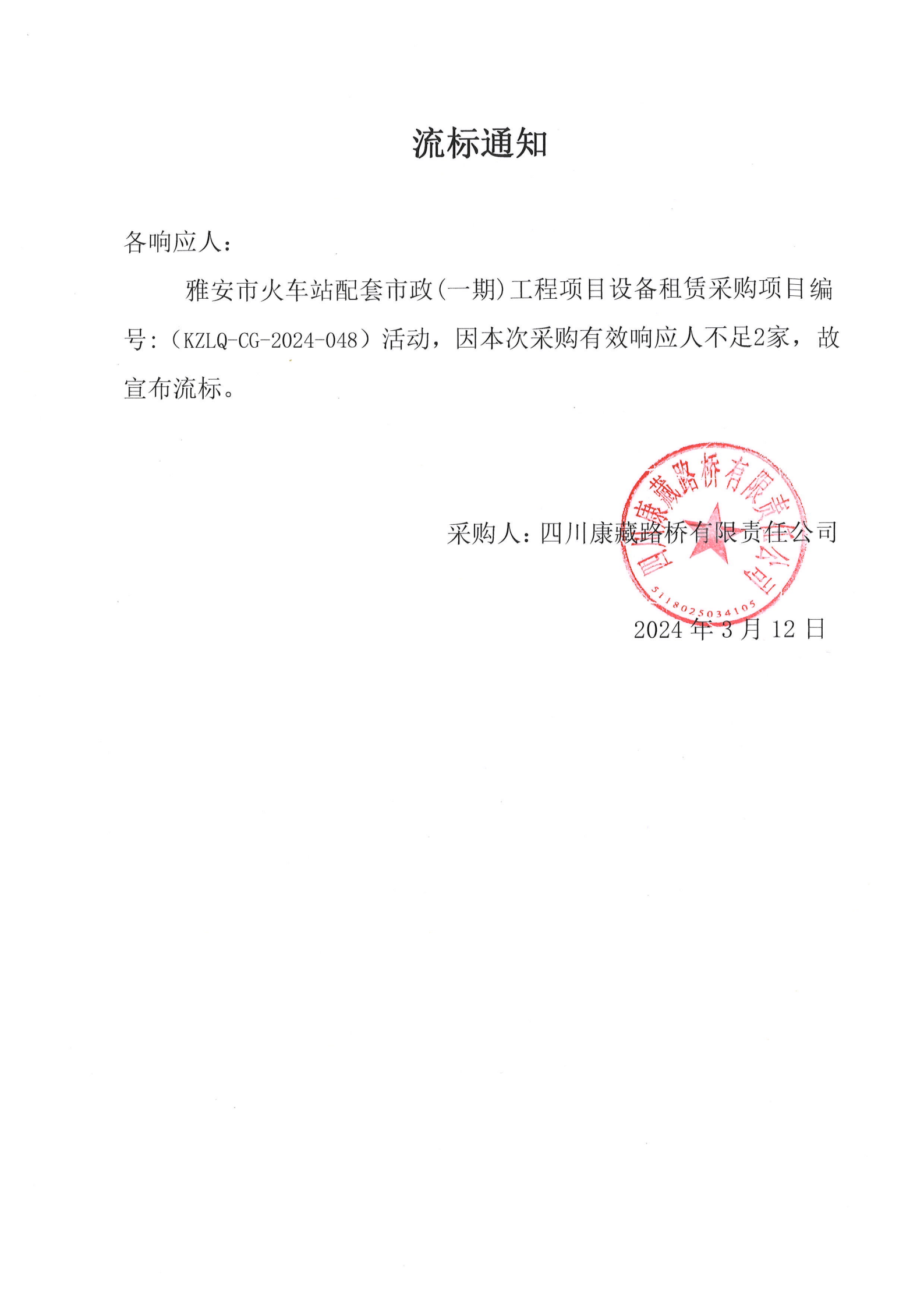 四川康藏路橋有限責(zé)任公司雅安市火車站配套市政(一期)工程項(xiàng)目設(shè)備租賃采購(gòu)流標(biāo)通知