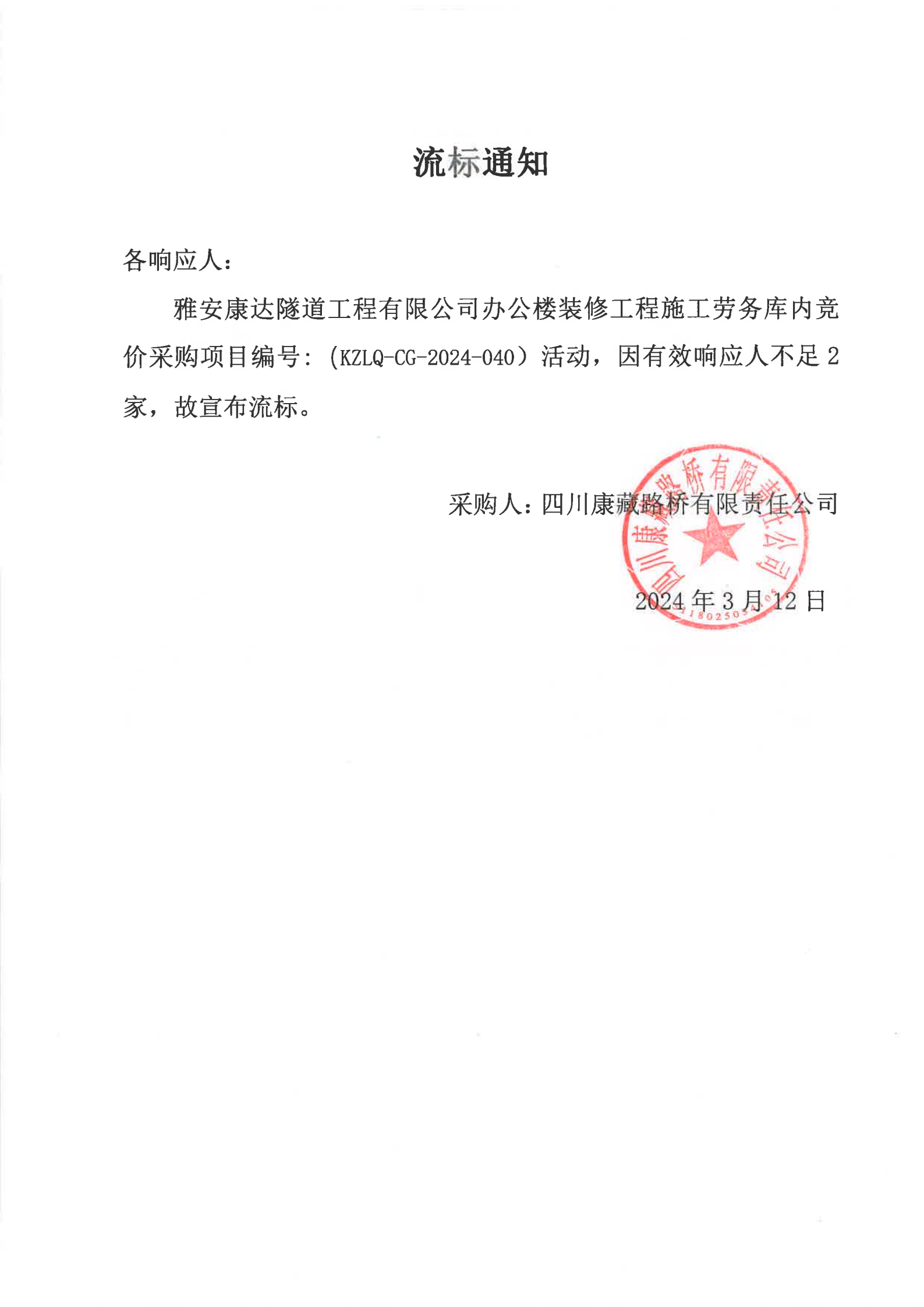 雅安康達隧道工程有限公司辦公樓裝修工程施工勞務(wù)庫內(nèi)競價采購流標通知
