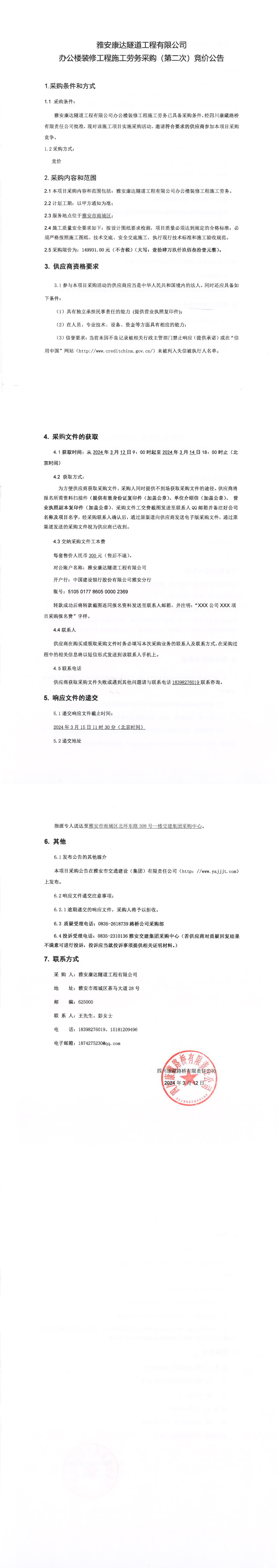 雅安康達(dá)隧道工程有限公司辦公樓裝修工程施工勞務(wù)競價采購(第二次)公告