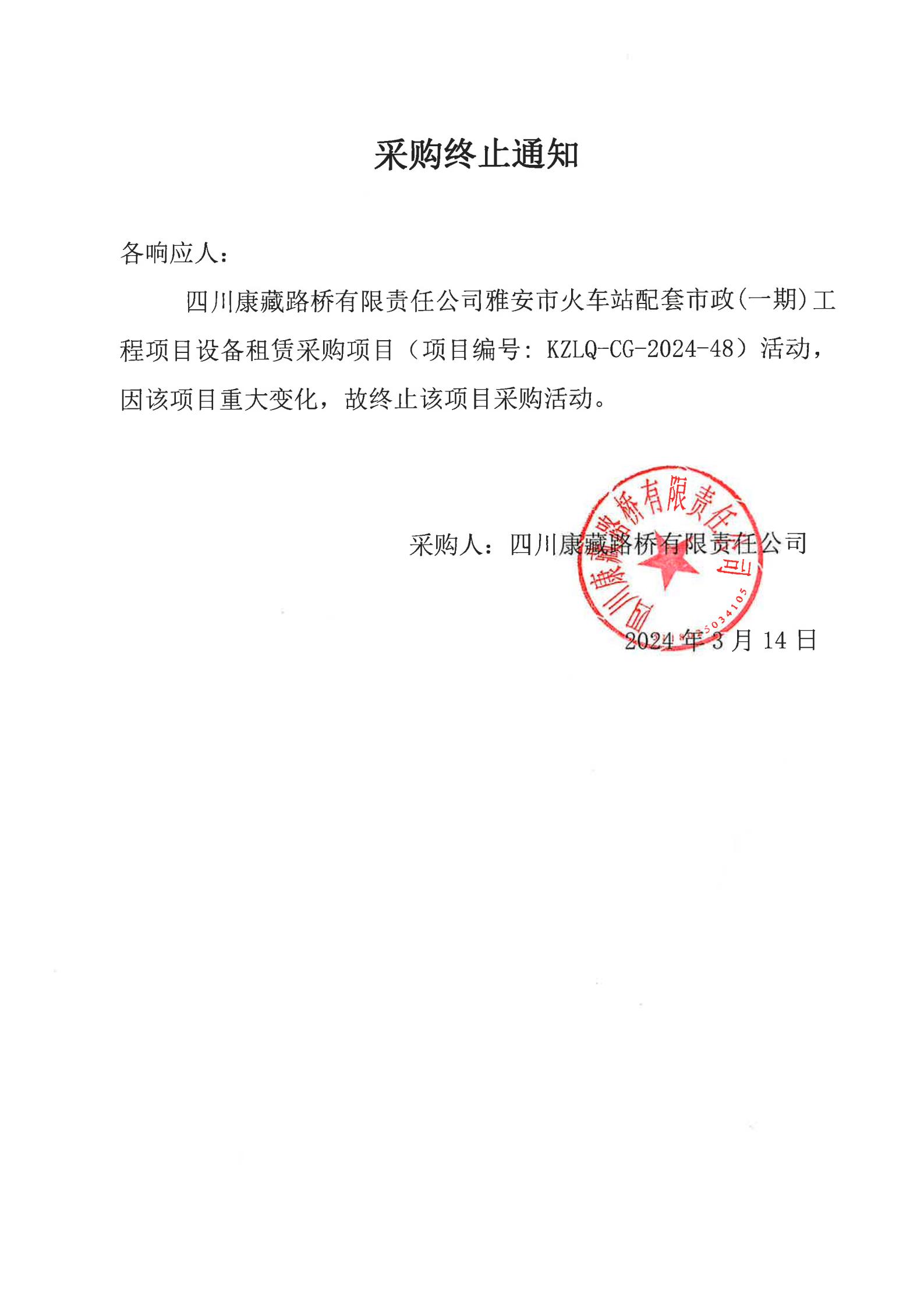 四川康藏路橋有限責(zé)任公司雅安市火車站配套市政(一期)工程項(xiàng)目設(shè)備租賃采購(gòu)終止通知