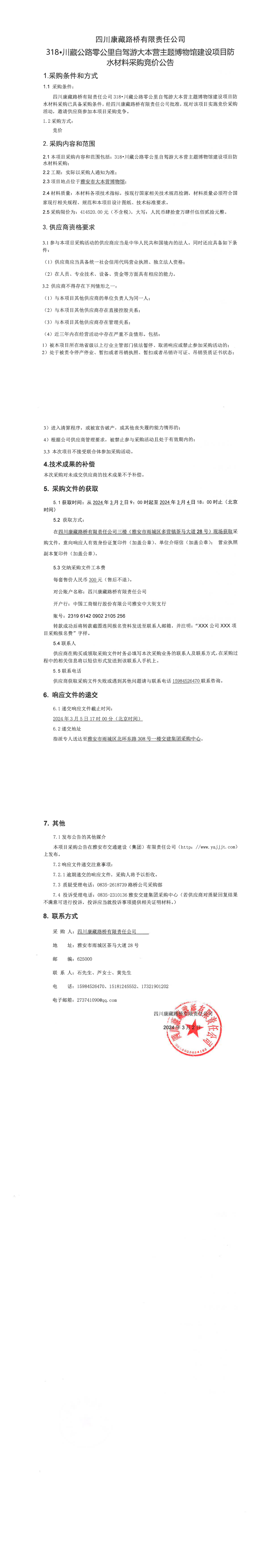 四川康藏路橋有限責(zé)任公司318·川藏公路零公里自駕游大本營主題博物館建設(shè)項目防水材料采購競價公告