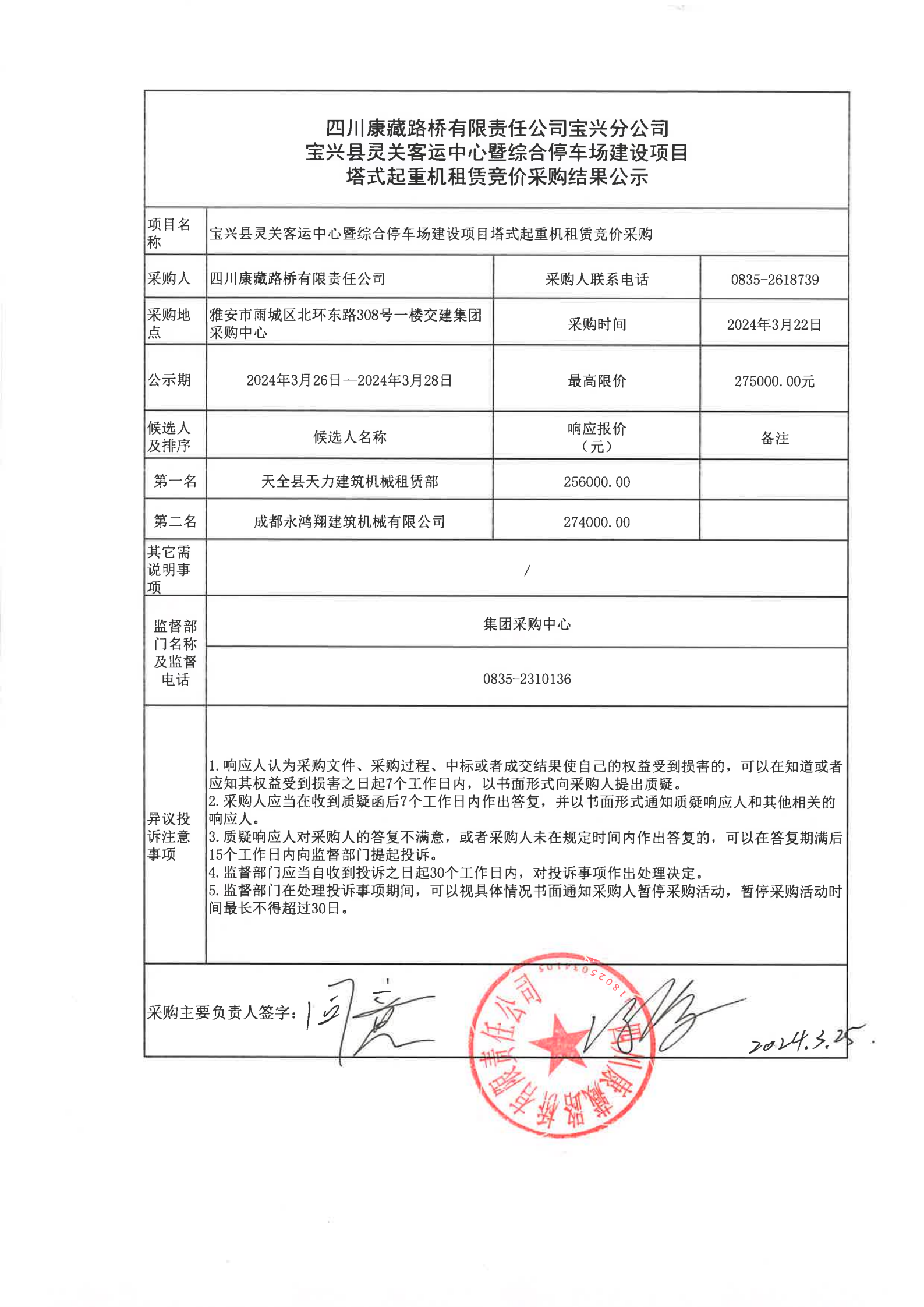 四川康藏路橋有限責(zé)任公司寶興縣靈關(guān)客運(yùn)中心暨綜合停車場(chǎng)建設(shè)項(xiàng)目塔式起重機(jī)租賃競(jìng)價(jià)采購(gòu)結(jié)果公示