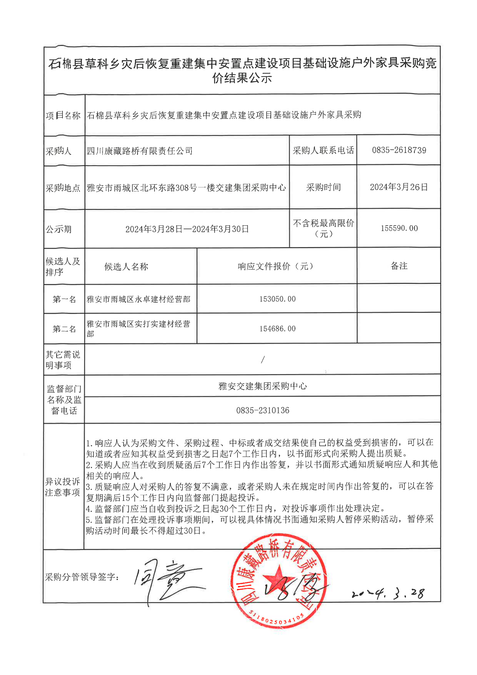 四川康藏路橋有限責(zé)任公司石棉縣草科鄉(xiāng)災(zāi)后恢復(fù)重建集中安置點(diǎn)建設(shè)項(xiàng)目基礎(chǔ)設(shè)施戶外家具采購競價(jià)結(jié)果公示