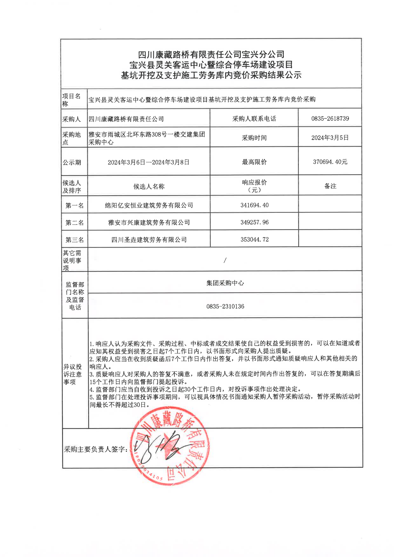 四川康藏路橋有限責任公司寶興分公司寶興縣靈關(guān)客運中心暨綜合停車場建設(shè)項目基坑開挖及支護施工勞務(wù)庫內(nèi)競價采購結(jié)果公示