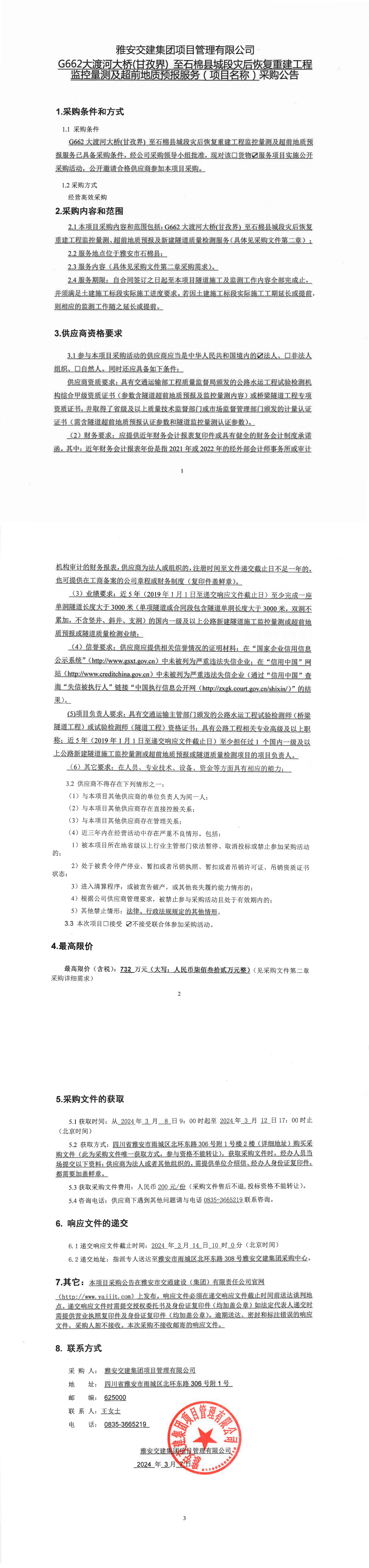 雅安交建集團(tuán)項(xiàng)目管理有限公司G662大渡河大橋(甘孜界)至石棉縣城段災(zāi)后恢復(fù)重建工程監(jiān)控量測(cè)及超前地質(zhì)預(yù)報(bào)服務(wù)(項(xiàng)目名稱)采購(gòu)公告