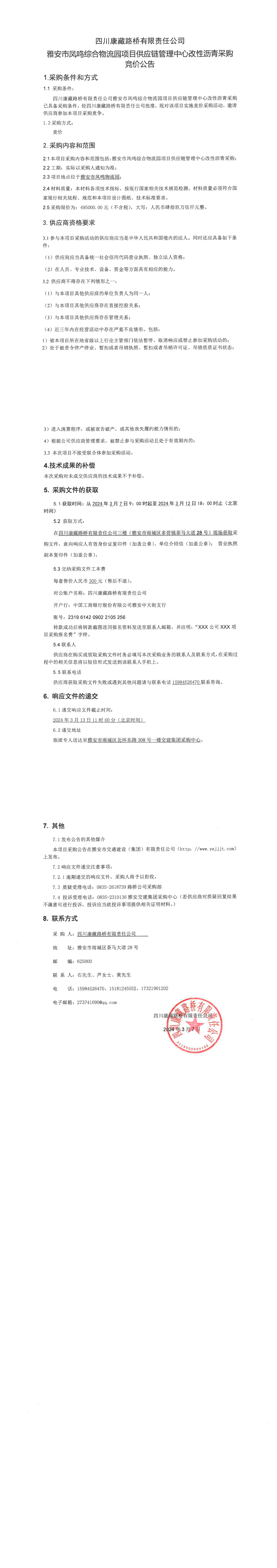 四川康藏路橋有限責任公司雅安市鳳鳴綜合物流園項目供應鏈管理中心改性瀝青采購競價公告