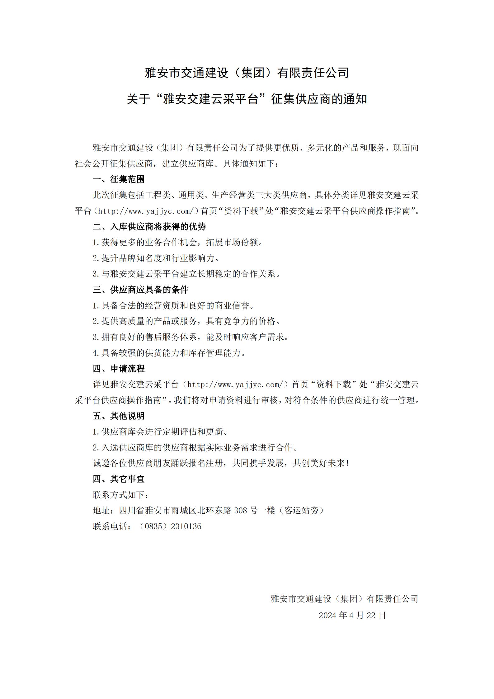 雅安市交通建設(shè)(集團(tuán))有限責(zé)任公司關(guān)于“雅安交建云采平臺”征集供應(yīng)商的通知