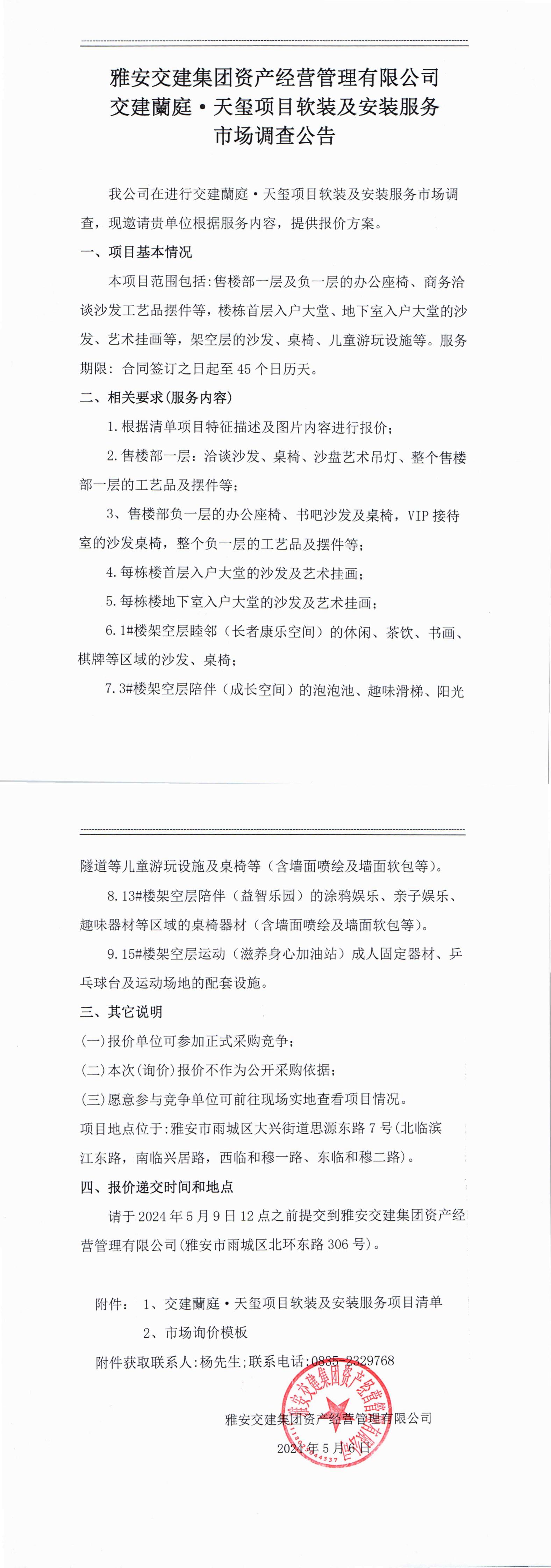 雅安交建集團(tuán)資產(chǎn)經(jīng)營管理有限公司交建蘭庭·天璽項目軟裝及安裝服務(wù)市場調(diào)查公告