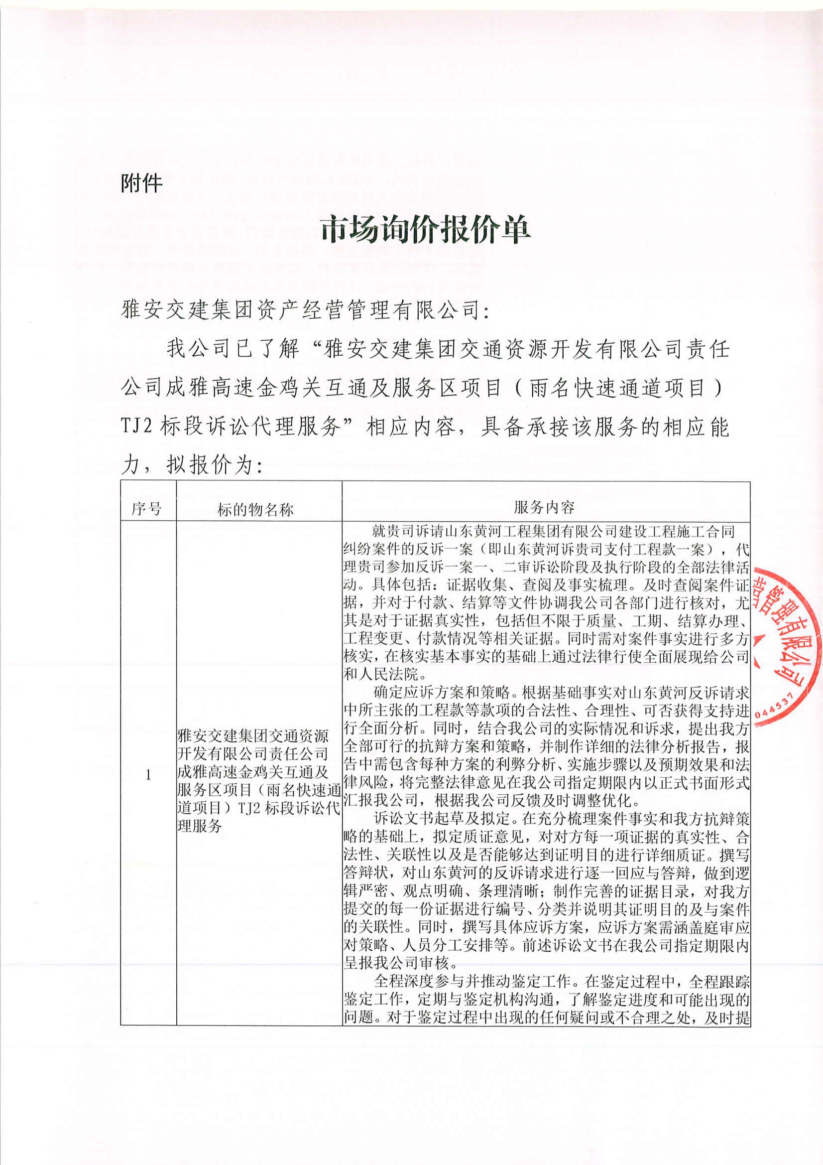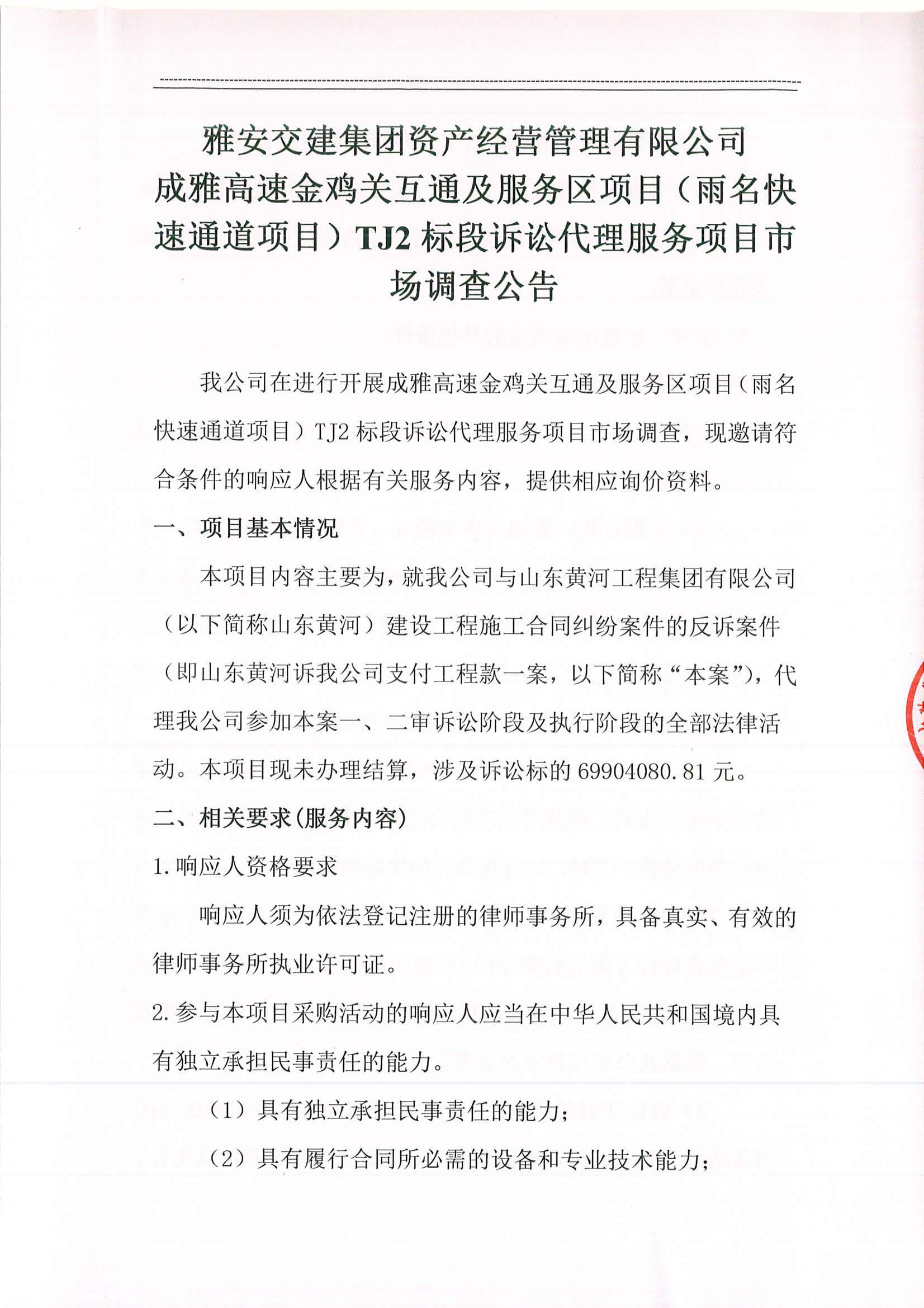 雅安交建集團資產(chǎn)經(jīng)營管理有限公司成雅高速金雞關(guān)互通及服務(wù)區(qū)項目(雨名快速通道項目)TJ2標段訴訟代理服務(wù)項目市場調(diào)查公告