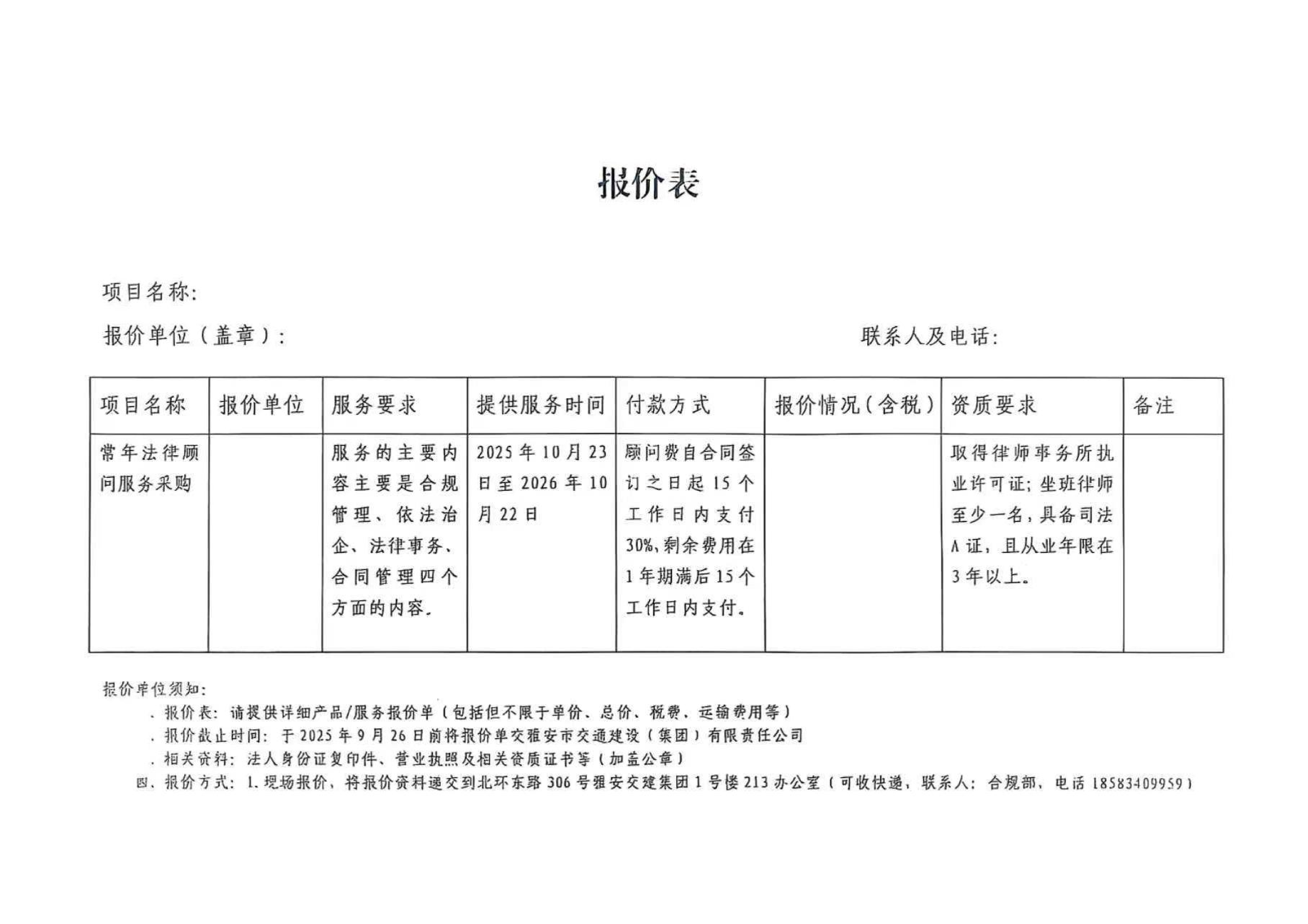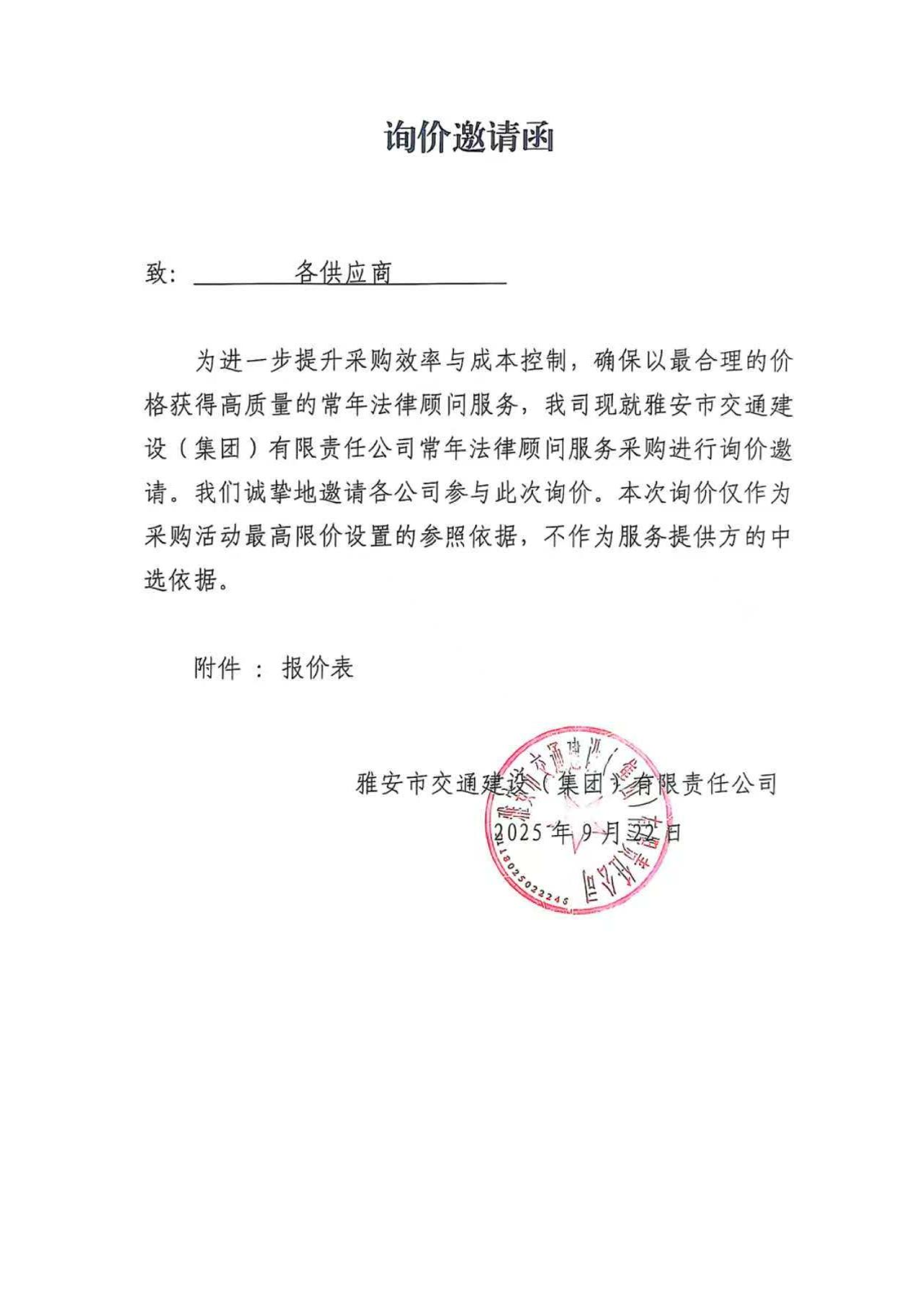關(guān)于雅安市交通建設(shè)(集團)有限責(zé)任公司常年法律顧問服務(wù)的詢價函