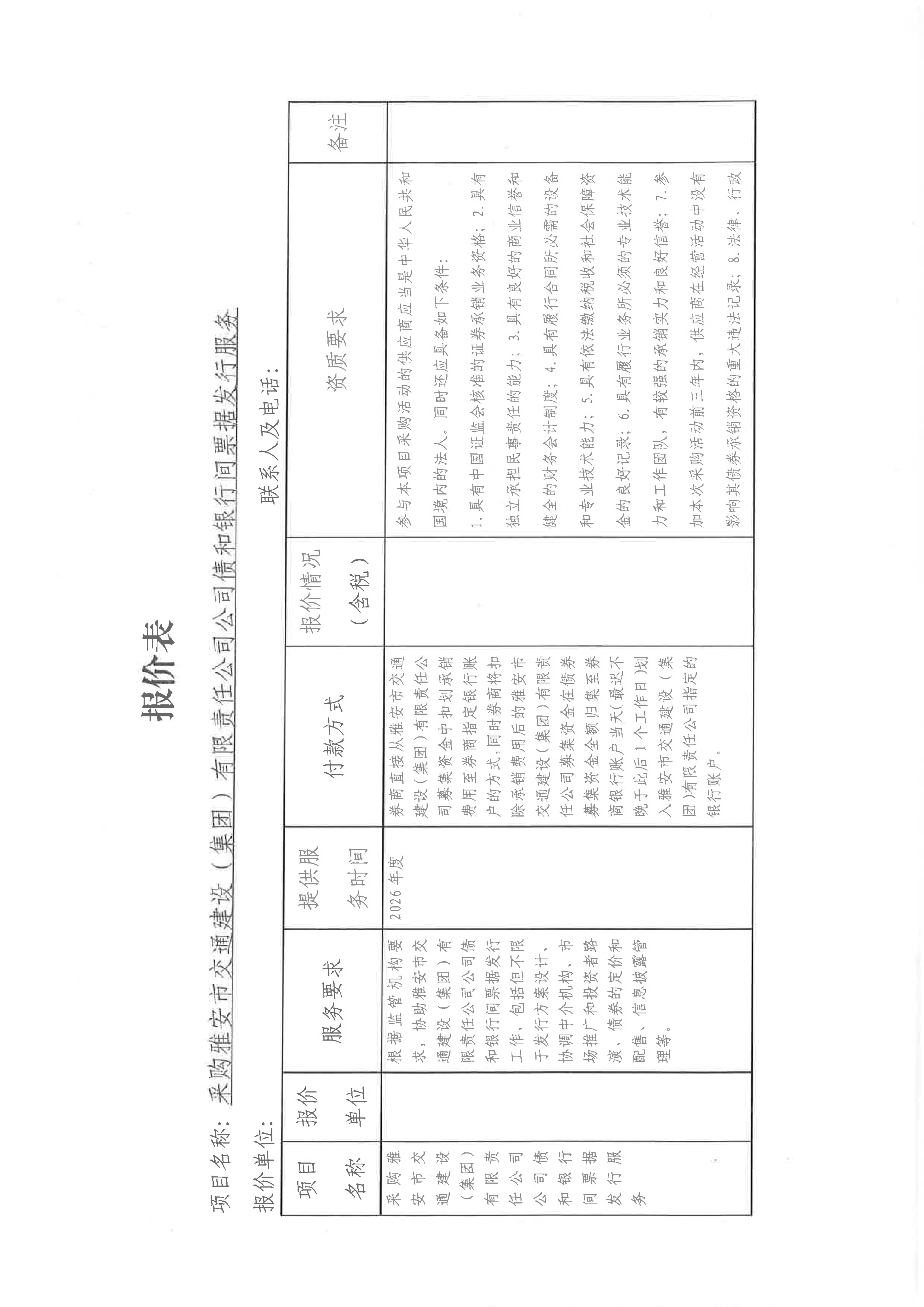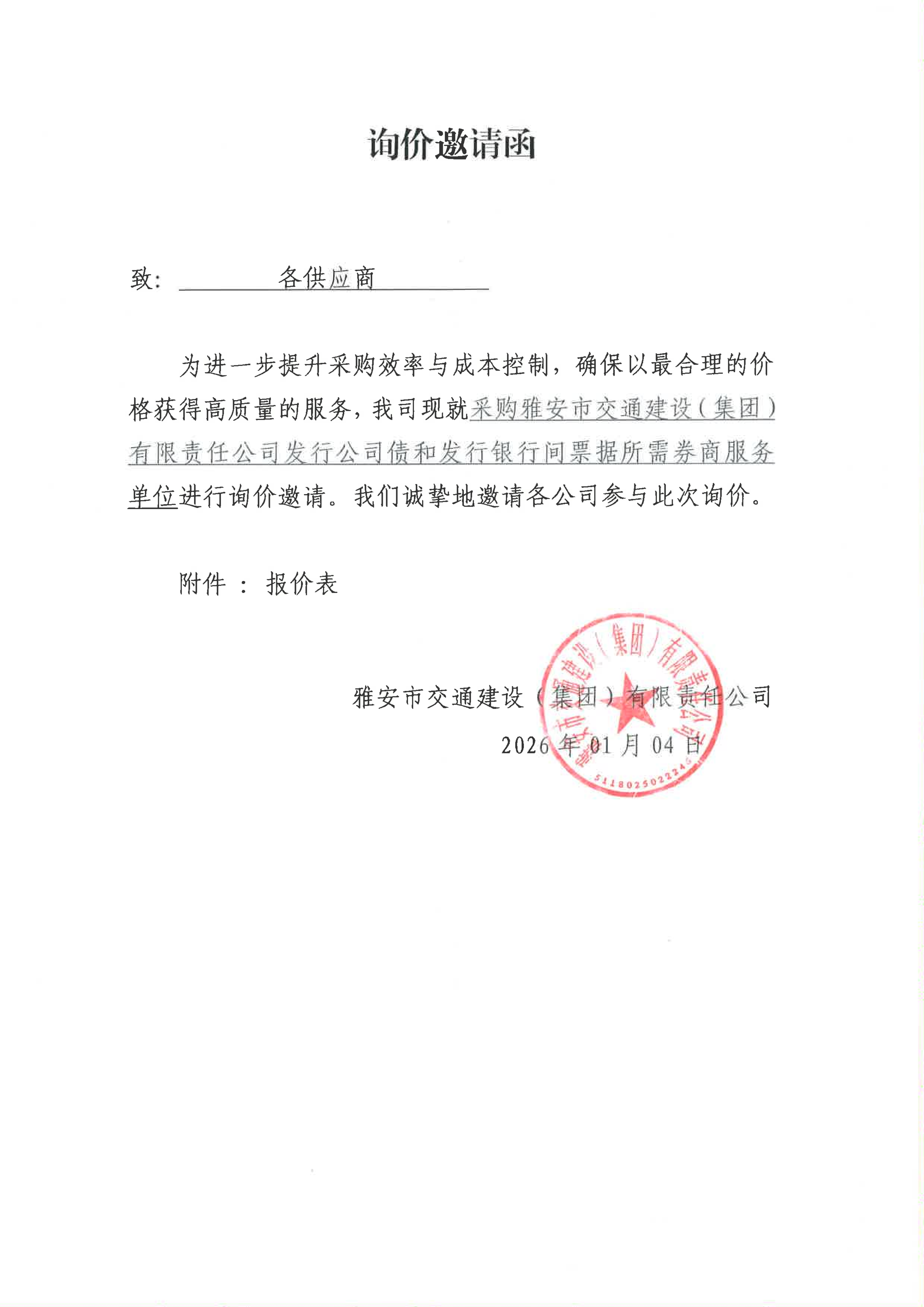 關(guān)于采購(gòu)雅安市交通建設(shè)(集團(tuán))有限責(zé)任公司發(fā)行公司債和發(fā)行銀行間票據(jù)所需券商服務(wù)限價(jià)的詢(xún)價(jià)函