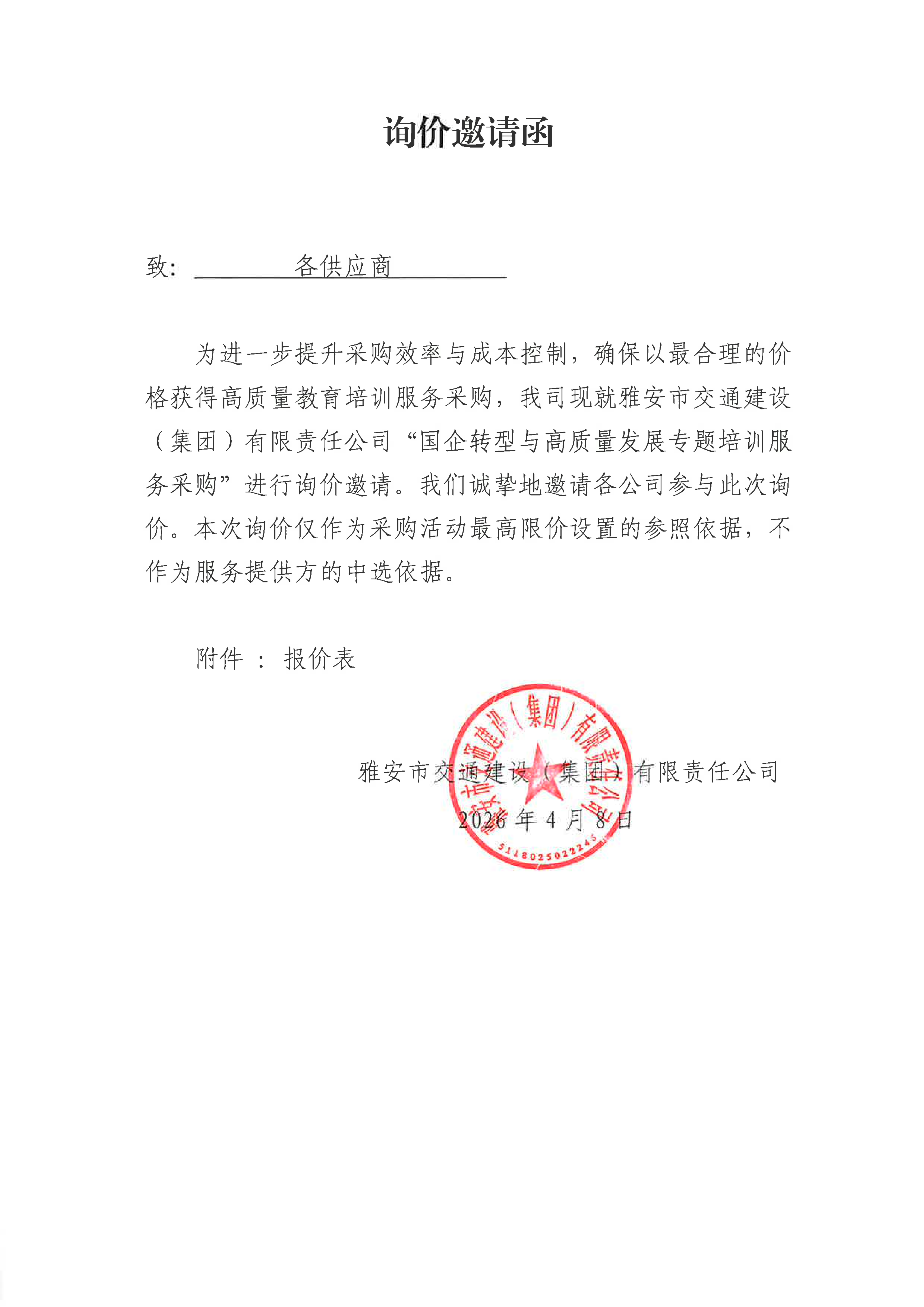 關(guān)于雅安市交通建設(shè)(集團)有限責(zé)任公司國企轉(zhuǎn)型與高質(zhì)量發(fā)展專題培訓(xùn)服務(wù)采購限價的詢價函