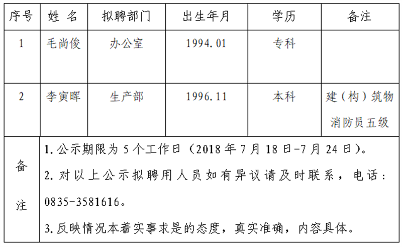 通過(guò)公開(kāi)報(bào)名、資格審查、面試等程序,經(jīng)公司研究確定以下2名擬聘用人員,現(xiàn)公示名單如下: