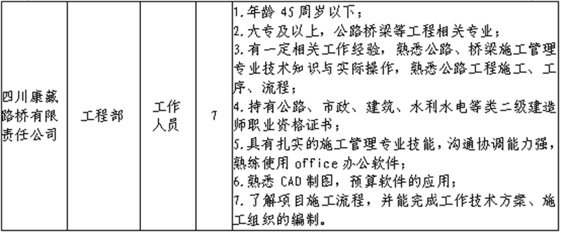 根據(jù)發(fā)展需要,決定面向社會公開招聘雅安市交通建設(集團)有限責任公司(以下簡稱“雅安交建集團”)所屬子公司工作人員16名,現(xiàn)將有關(guān)事項公告如下: