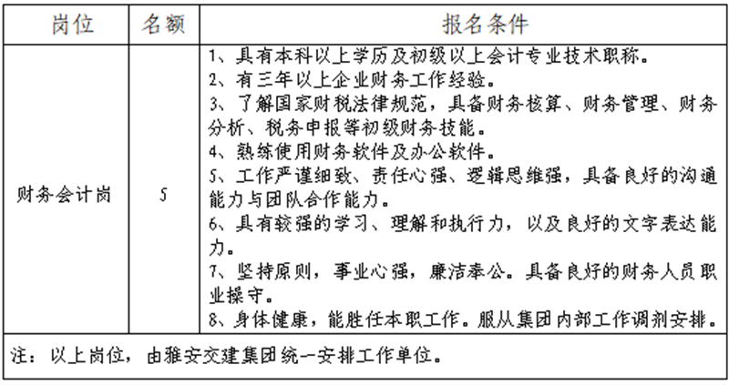 根據(jù)發(fā)展需要,決定面向社會公開招聘雅安市交通建設(shè)(集團(tuán))有限責(zé)任公司(以下簡稱“雅安交建集團(tuán)”)所屬子公司財(cái)務(wù)工作人員5名,現(xiàn)將有關(guān)事項(xiàng)公告如下: