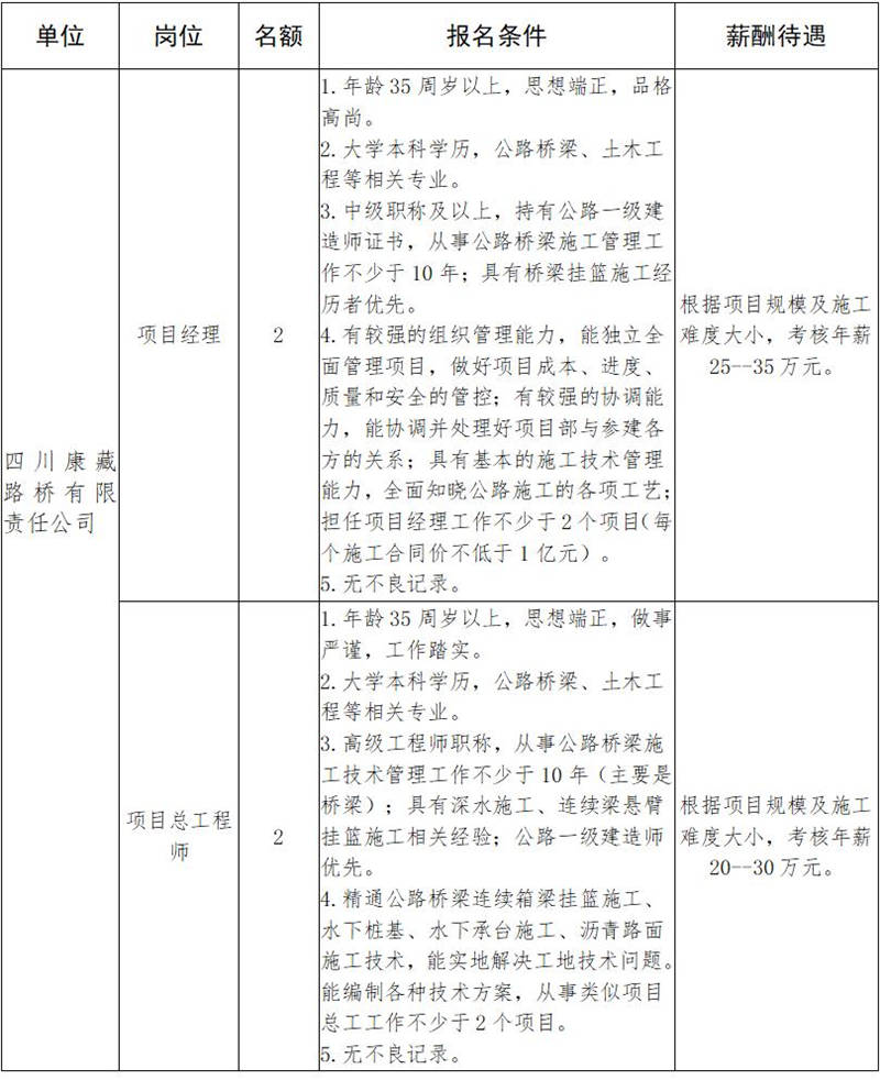 根據(jù)發(fā)展需要,決定面向社會(huì)公開招聘雅安市交通建設(shè)(集團(tuán))有限責(zé)任公司(以下簡(jiǎn)稱“雅安交建集團(tuán)”)所屬子公司工程項(xiàng)目主要負(fù)責(zé)人10名,現(xiàn)將有關(guān)事項(xiàng)公告如下: