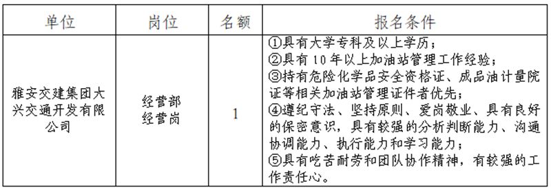 根據發(fā)展需要,決定面向社會公開招聘雅安市交通建設(集團)有限責任公司(以下簡稱“雅安交建集團”)所屬子公司工作人員1名,現(xiàn)將有關事項公告如下: