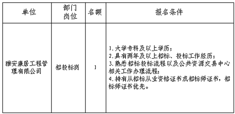 根據(jù)發(fā)展需要,決定面向社會公開招聘雅安市交通建設(shè)(集團)有限責任公司(以下簡稱“雅安交建集團”)所屬子公司工作人員1名,現(xiàn)將有關(guān)事項公告如下: