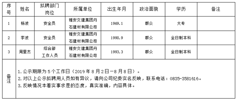 雅安交建集團(tuán)子公司擬聘用人員公示(丹石建材公司)