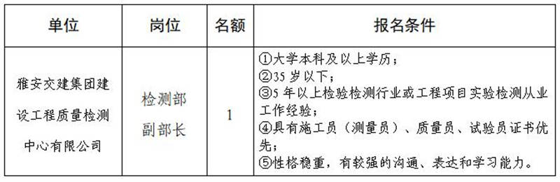 根據(jù)發(fā)展需要,決定面向社會(huì)公開(kāi)招聘雅安市交通建設(shè)(集團(tuán))有限責(zé)任公司(以下簡(jiǎn)稱(chēng)“雅安交建集團(tuán)”)所屬子公司中層干部1名,現(xiàn)將有關(guān)事項(xiàng)公告如下: