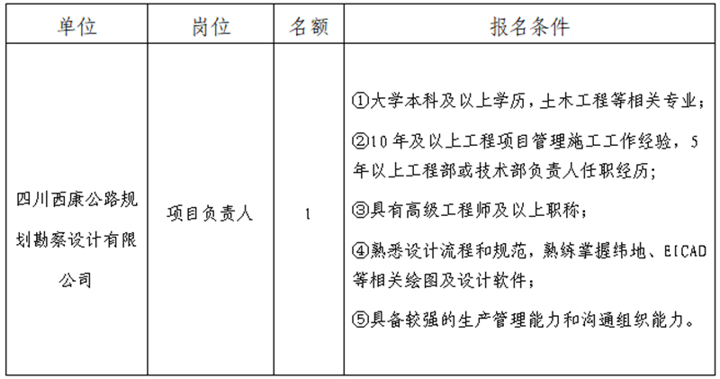 根據(jù)發(fā)展需要,決定面向社會公開招聘雅安市交通建設(shè)(集團)有限責(zé)任公司(以下簡稱“雅安交建集團”)所屬子公司項目負責(zé)人1名,現(xiàn)將有關(guān)事項公告如下: